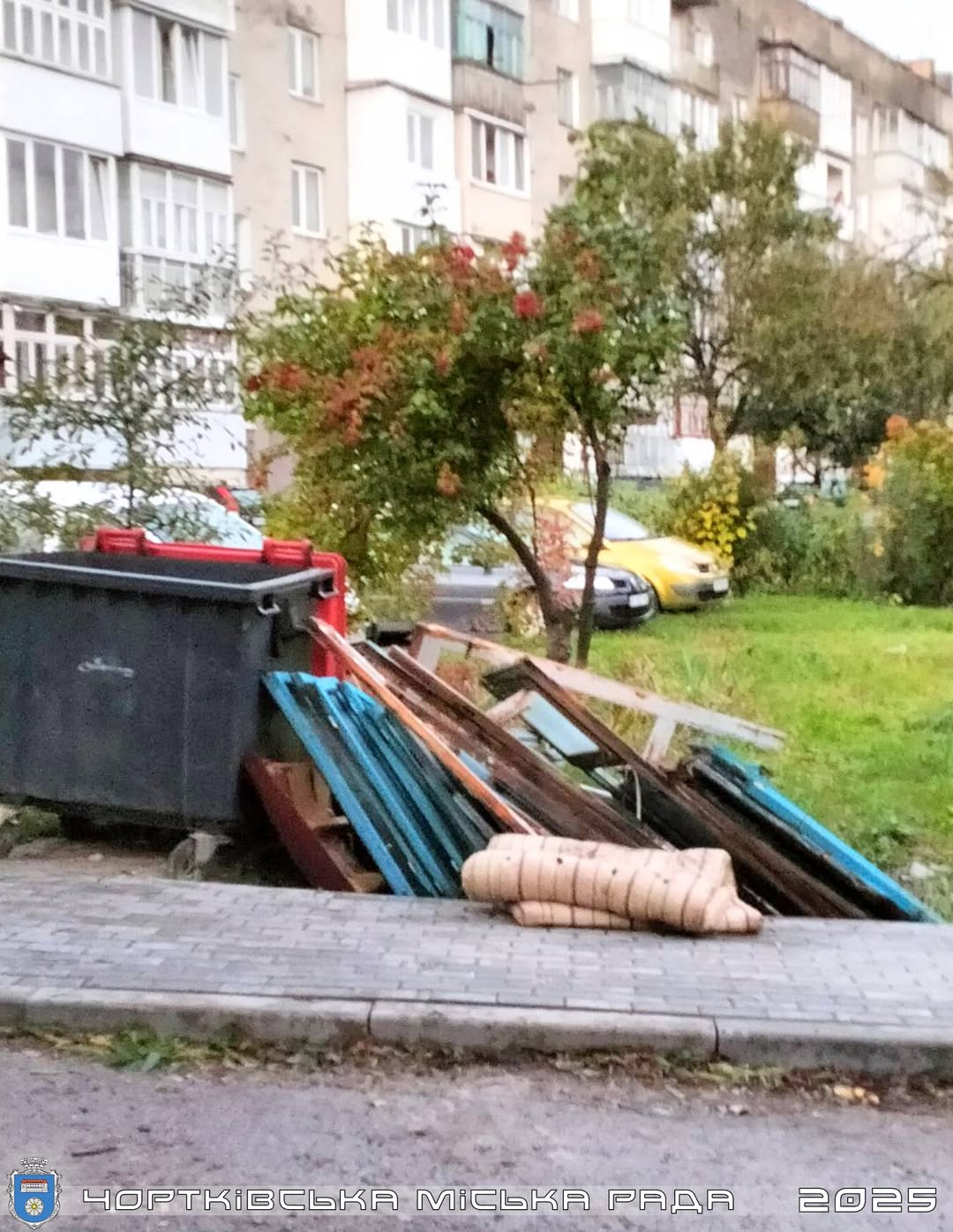 Окремо звертаємо увагу голів ОСББ та власників приватних домогосподарств: якщо буде виявлено, що ви викидаєте подібні відходи неналежним чином (як на фото нижче), ви будете притягнуті до адміністративної відповідальності за порушення «Правил благоустрою Чортківської громади».