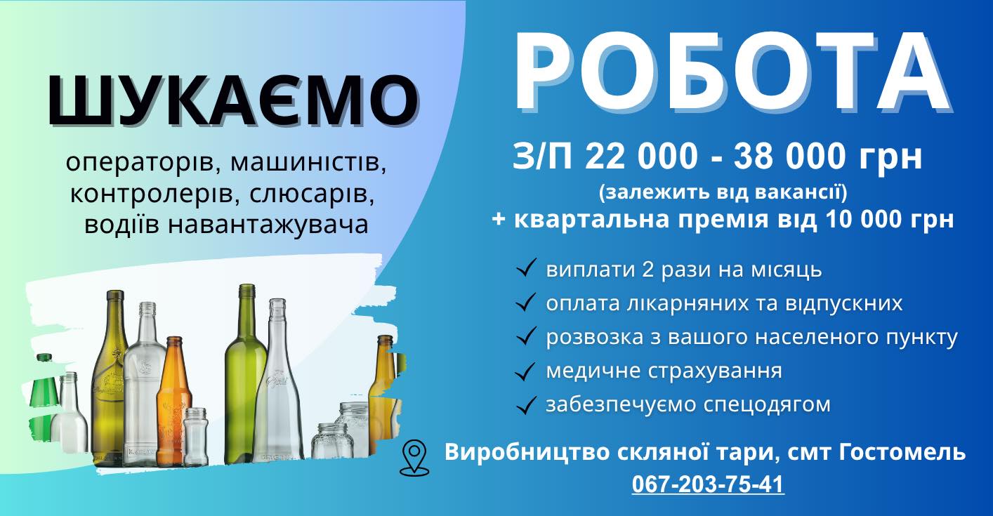 ПрАТ «Ветропак Гостомельський Склозавод» активно шукає талановитих працівників та запрошує на роботу за такими спеціальностями: