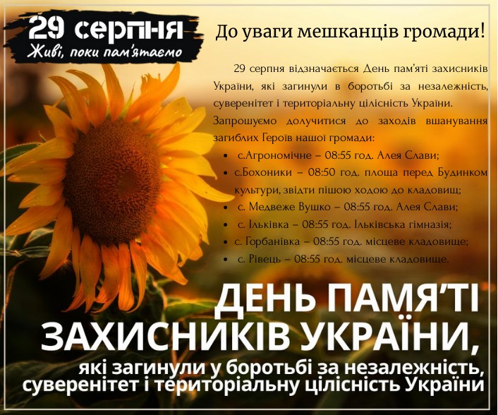 29 серпня – це особливий день, День пам’яті захисників України. Цього дня ми вшановуємо всіх, хто віддав своє життя, виборюючи незалежність, суверенітет та територіальну цілісність нашої Батьківщини. Особливо ми схиляємо голови перед пам’яттю загиблих Героїв нашої громади, чиї подвиги навічно закарбувалися в наших серцях. Їхня самовідданість і мужність є прикладом для наслідування. Ми запрошуємо кожного мешканця громади приєднатися до заходів, присвячених вшануванню цих мужніх людей. Давайте разом згадаємо тих, хто поклав своє життя заради мирного неба над нашими головами. Ваша пам’ять – це найвища нагорода для тих, хто боровся за нашу свободу. Приєднуйтесь до нас, щоб віддати шану нашим полеглим захисникам.