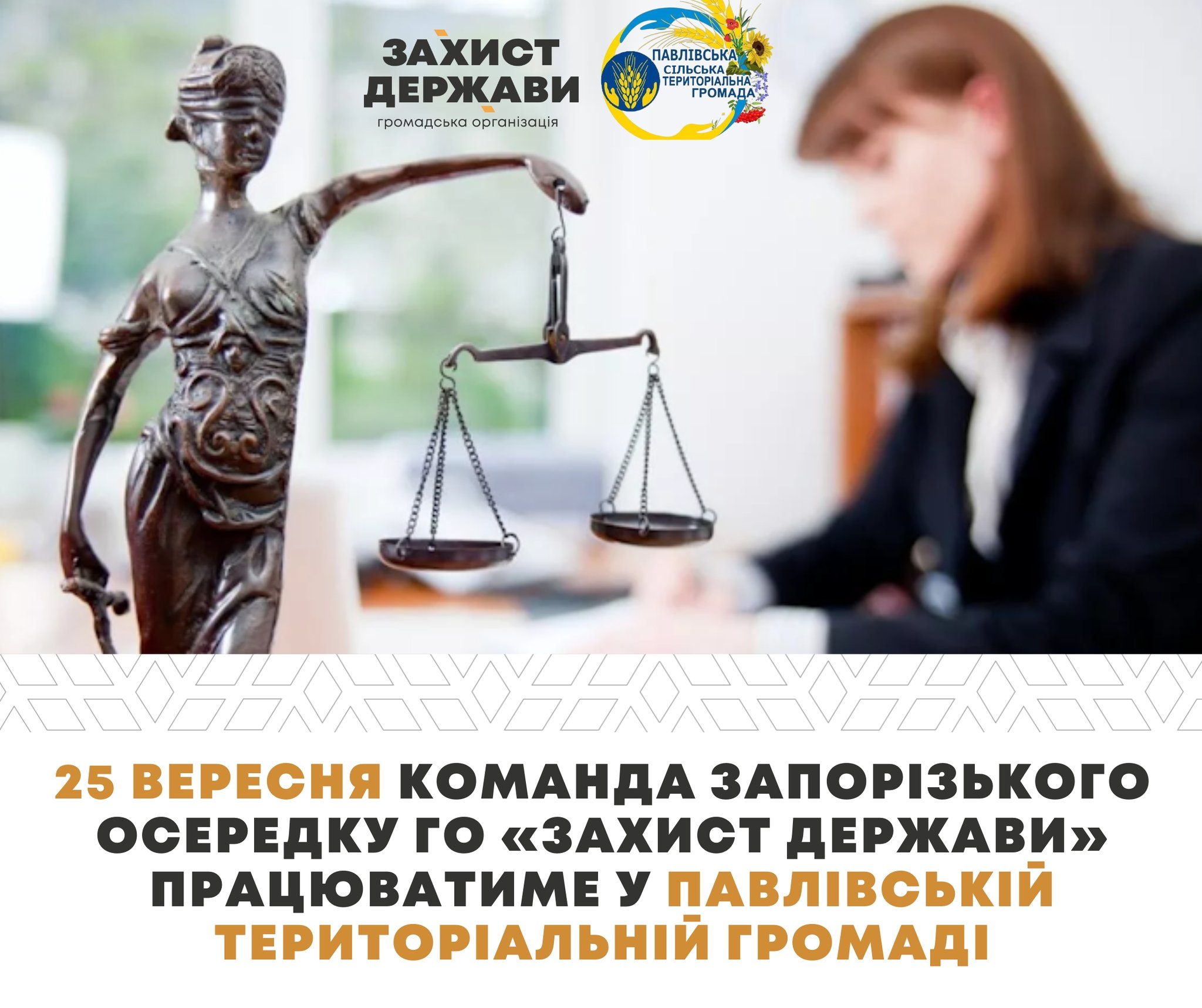 У четвер, 25 вересня, команда Запорізького осередку ГО «Захист держави» проведе виїзний прийом у Павлівській сільській територіальній громаді Запорізької області. Ця ініціатива реалізується в рамках підписаного меморандуму про співпрацю, спрямованого на надання всебічної підтримки мешканцям громади.