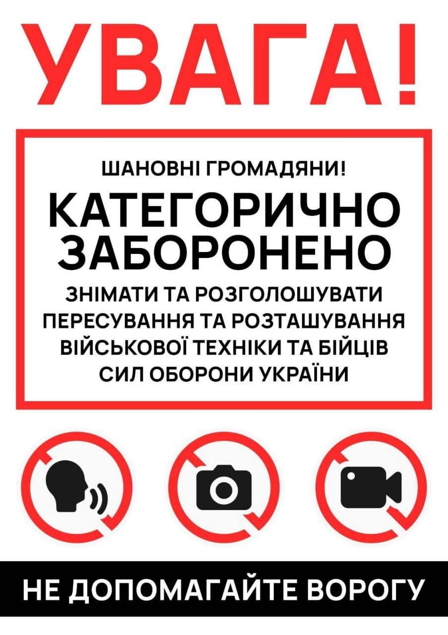 ⚠️ Увага, жителі прикордонних зон Сумщини! Нагадуємо про важливість дотримання правил безпеки в умовах воєнного стану. Будь-які дії, що можуть поставити під загрозу безпеку наших захисників та цивільного населення, суворо заборонені. Це стосується насамперед фото- та відеофіксації переміщень військової техніки та особового складу Сил оборони України. Заборонено також поширювати будь-яку інформацію про такі переміщення в будь-якій формі. Поширення цих відомостей напряму шкодить нашим військовим і фактично допомагає ворожим силам. Це може призвести до серйозних наслідків. Пам’ятайте, що розголошення такої інформації відповідно до статті 114-2 Кримінального кодексу України карається позбавленням волі на строк від 5 до 8 років. Не допомагайте ворогу, зберігайте інформаційну тишу. Ваша обачність – це внесок у нашу спільну безпеку.