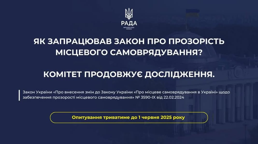 🏣 Комітет державної влади, місцевого самоврядування, регіонального розвитку та містобудування ВРУ проводить дослідження практики застосування та ефективності Закону України № 3590-IX від 22.02.2024 «Про внесення змін до Закону України «Про місцеве самоврядування в Україні» щодо забезпечення прозорості місцевого самоврядування». Дослідження триватиме до 1 червня 2025 року.