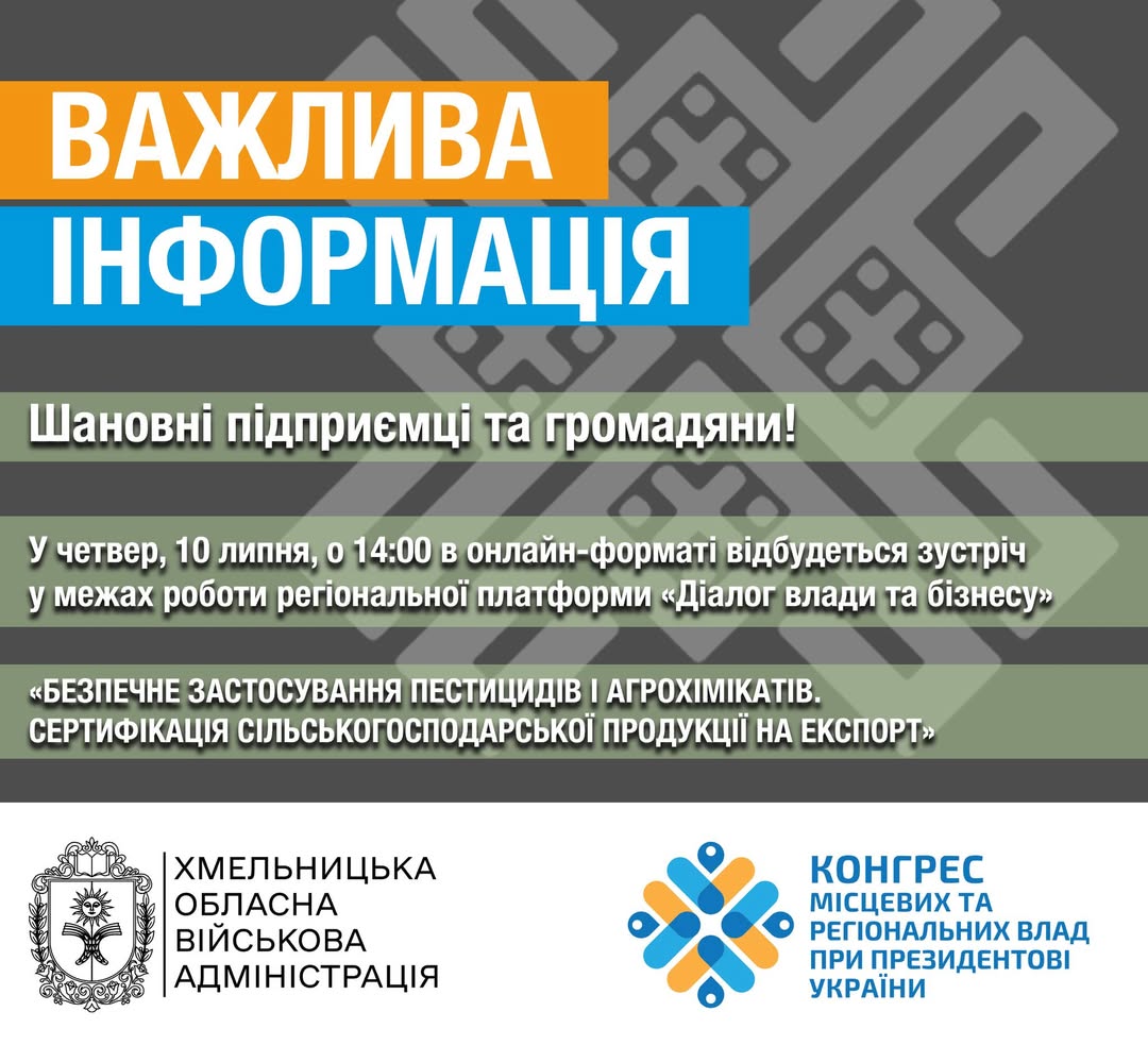 До уваги підприємців та громадян Хмельницької області!Запрошуємо вас взяти активну участь у черговій зустрічі в рамках важливої регіональної платформи «Діалог влади та бізнесу», що відбудеться у четвер, 10 липня, о 14:00. Ця подія пройде в зручному онлайн-форматі, що дозволить долучитися до обговорення ключових питань розвитку агропромислового комплексу регіону з будь-якого куточка. Тема зустрічі надзвичайно актуальна для сучасного агробізнесу: «Безпечне застосування пестицидів і агрохімікатів. Сертифікація сільськогосподарської продукції на експорт».Питання безпечного застосування пестицидів та агрохімікатів є наріжним каменем сталого землеробства та забезпечення високої якості продукції. Це не лише вимога законодавства, але й запорука збереження здоров’я споживачів та довкілля. На зустрічі будуть детально розглянуті сучасні норми та стандарти, найкращі практики, що дозволяють мінімізувати ризики та оптимізувати використання цих засобів. Фахівці поділяться рекомендаціями щодо ефективного та відповідального підходу до роботи з агрохімікатами, що є критично важливим для кожного аграрія, який прагне до успіху та відповідності міжнародним вимогам. Розуміння принципів безпечного застосування пестицидів допоможе уникнути штрафів та забезпечити екологічну чистоту продукції.Окрему увагу буде приділено сертифікації сільськогосподарської продукції для експорту. В умовах зростаючої конкуренції на світових ринках, відповідність міжнародним стандартам якості та безпеки є ключовою перевагою. Обговорення охопить процедури сертифікації, вимоги до документації, а також потенційні ринки збуту для української агропродукції. Ця інформація буде цінною для підприємств, що планують вихід на міжнародні ринки або прагнуть розширити свою присутність за кордоном. Отримання необхідних сертифікатів відкриває нові можливості та зміцнює позиції на глобальній арені. Експорт агропродукції, яка відповідає найвищим стандартам, є стратегічним напрямком розвитку економіки регіону.Платформа «Діалог влади та бізнесу» є ініціативою Департаменту економічного розвитку Хмельницької ОВА, спрямованою на створення ефективної комунікації між державними органами та представниками підприємництва. Такі зустрічі дозволяють оперативно реагувати на виклики, обговорювати актуальні питання, що стосуються розвитку бізнесу в регіоні, та спільно шукати шляхи їх вирішення. Це унікальна можливість поставити питання безпосередньо представникам влади та отримати кваліфіковані відповіді. Участь у діалозі сприяє формуванню сприятливого бізнес-середовища та підвищенню конкурентоспроможності місцевих підприємств. Саме такий формат дозволяє обговорити важливі теми, як-от безпечне застосування пестицидів та агрохімікатів, з усіх сторін.Щоб стати учасником цієї важливої онлайн-зустрічі та отримати доступ до цінної інформації, будь ласка, заповніть форму за посиланням: https://salo.li/7FB0d5e. Не упустіть можливість поглибити свої знання та покращити практичні навички у сфері агробізнесу. Для отримання додаткової інформації або довідок ви можете звернутися за телефоном: (0382) 76-51-52, до Департаменту економічного розвитку Хмельницької ОВА. Ваша участь є внеском у спільний розвиток агропромислового комплексу Хмельниччини. Це важливий крок до сталого р
