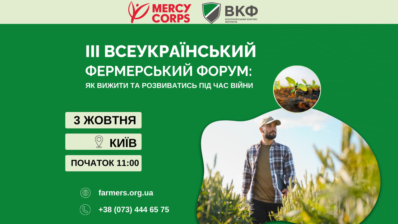 Всеукраїнський конгрес фермерів, у співпраці з міжнародною гуманітарною організацією MERCY CORPS, має честь запросити вас на **«Третій всеукраїнський фермерський форум: як вижити та розвиватись під час війни»**. Цей важливий захід стане платформою для обміну досвідом, пошуку рішень та підтримки аграрного сектору України в умовах сучасних викликів.
