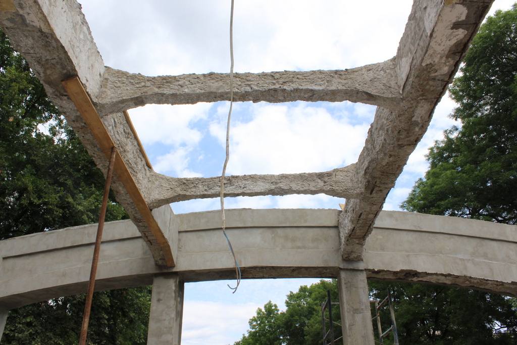доведення до кінця робіт на правій арці, яку вже оббили піскоструєм: нанесення штукатурки. Внутрішні поручні буде зроблено, як на арці зліва – спилено, відремонтовано, встановлено заново й погрунтувано, потім фарбування в сірий колір;