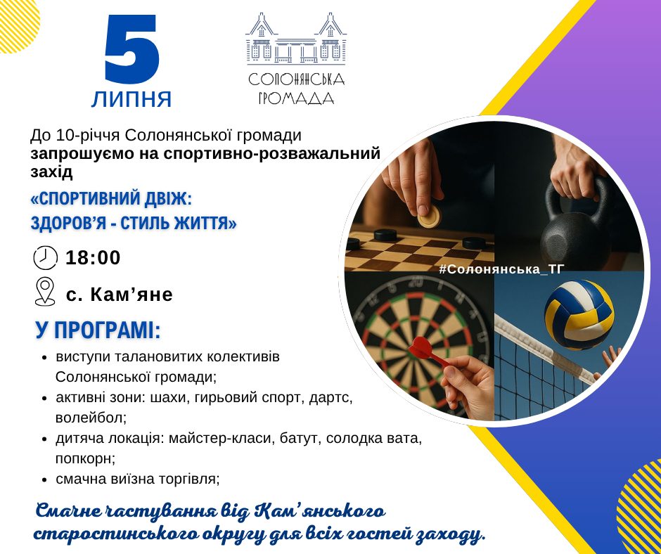До 10-річчя Солонянської громади! Запрошуємо на спортивно-розважальний захід “СПОРТИВНИЙ ДВІЖ: ЗДОРОВ’Я — СТИЛЬ ЖИТТЯ”!