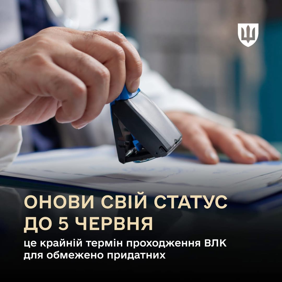 Міністерство оборони України нагадує, що особи, які до 4 травня 2024 року отримали рішення про обмежену придатність до військової служби, повинні повторно пройти військово-лікарську комісію (ВЛК) до 5 червня 2025 року. Це обов’язкова процедура, передбачена законодавством.