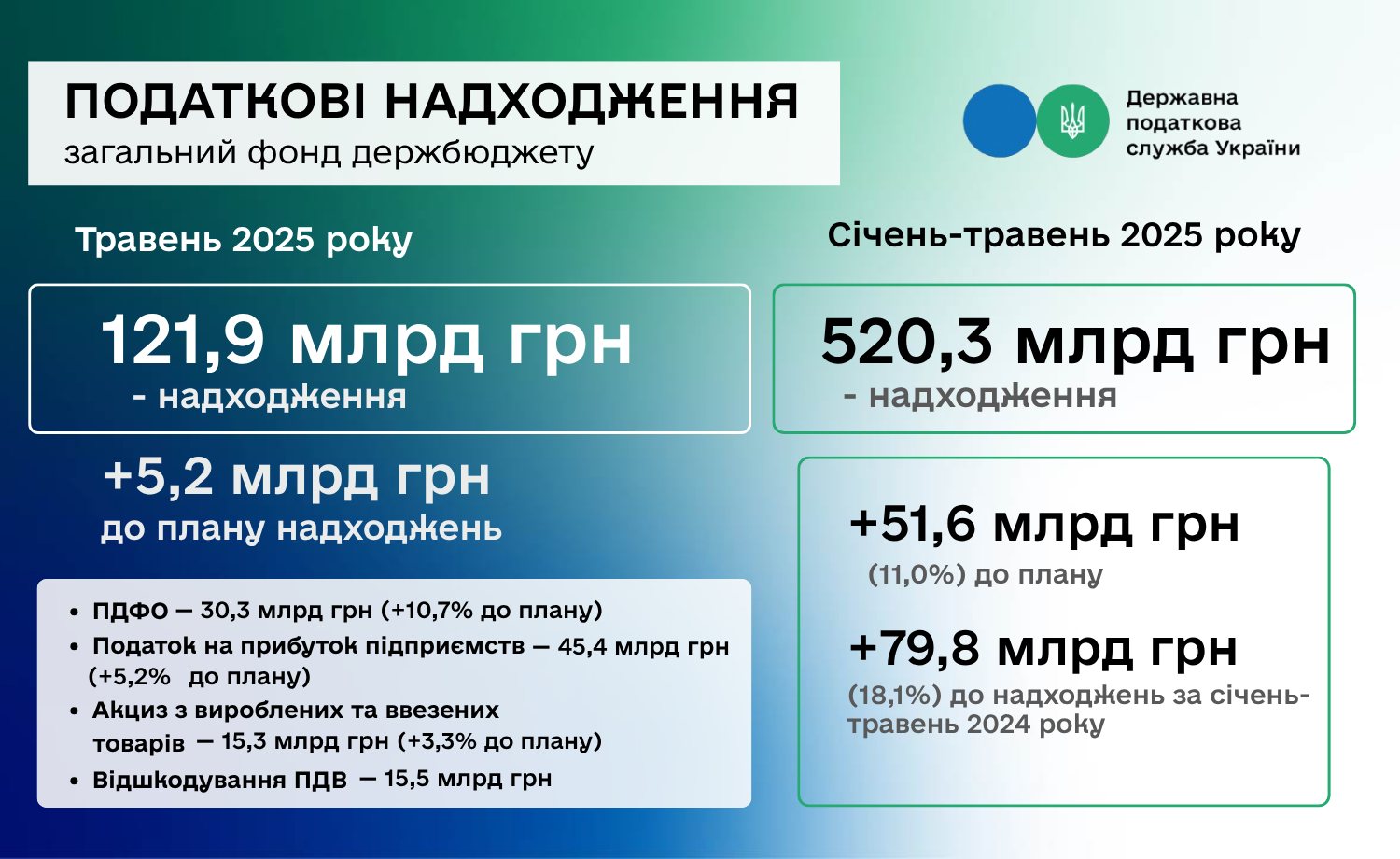 Надходження до загального фонду держбюджету за січень-травень 2025 року: