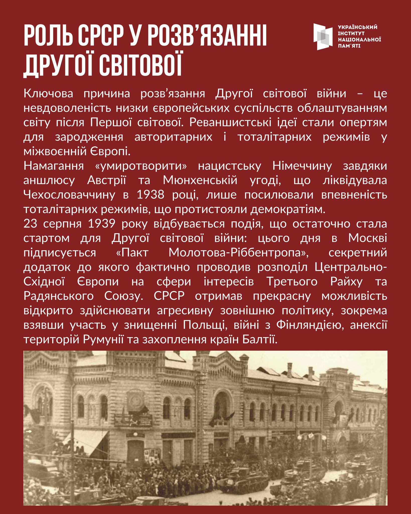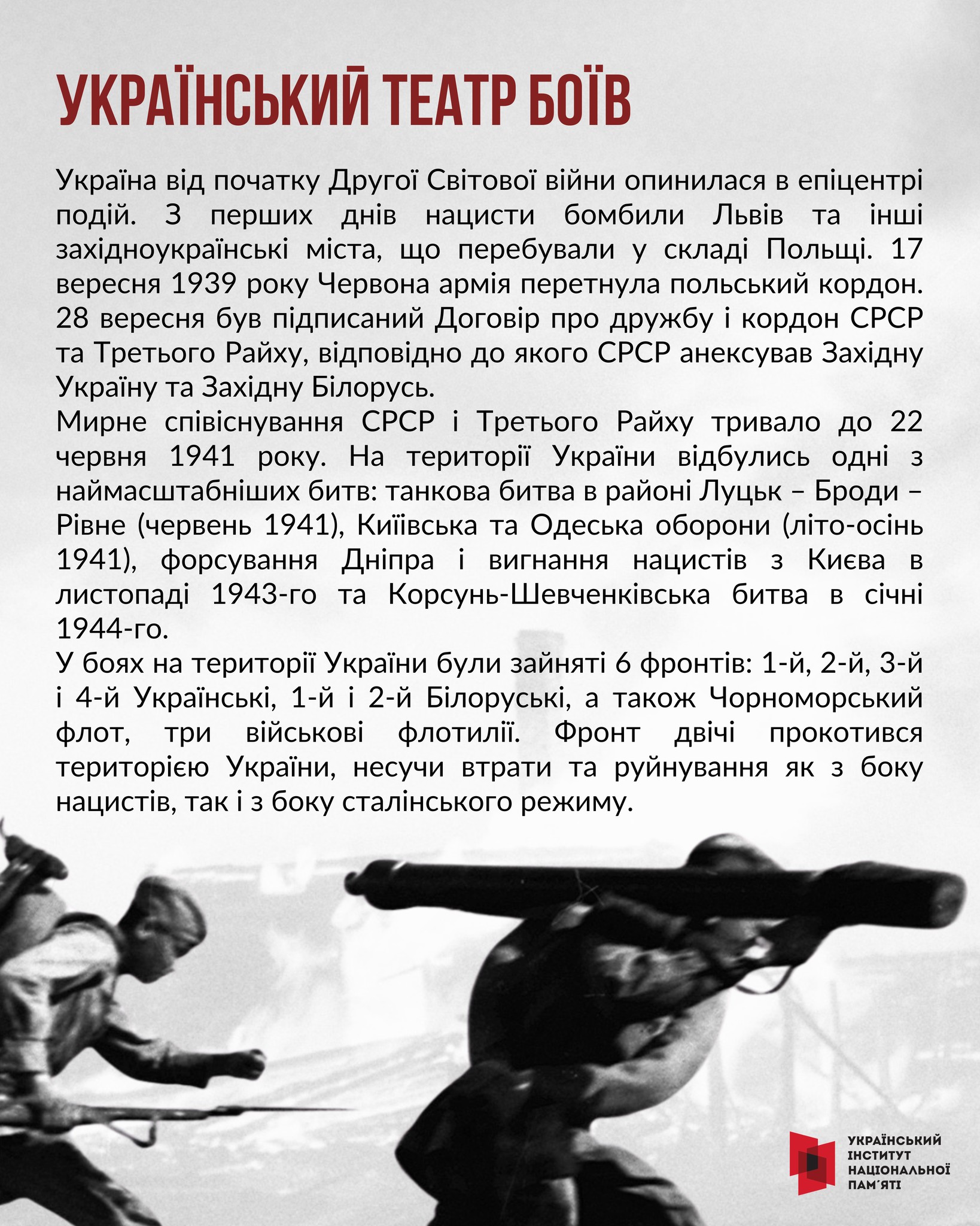 Українці зробили вагомий внесок у перемогу над нацизмом у Другій світовій війні. Вони виявили героїзм, хоробрість і самопожертву на різних фронтах та в багатьох арміях Антигітлерівської коаліції. Мільйони українців воювали у регулярних військах, а сотні тисяч – у підпільних і повстанських структурах. Промисловість України працювала на потреби оборони, а українська земля стала місцем масштабних і кровопролитних битв.