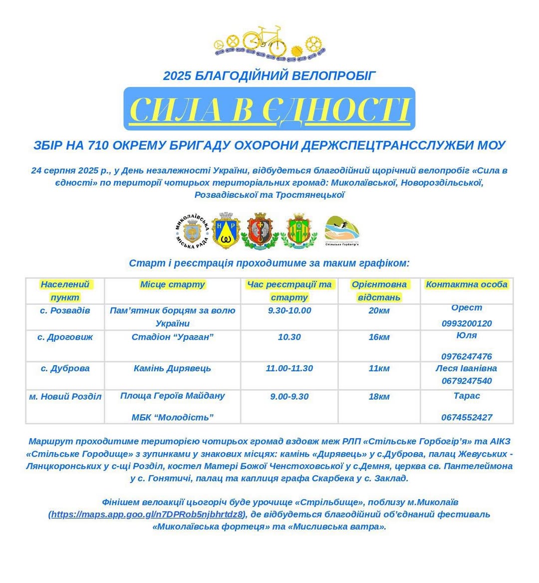🚴♀️ Друзі! Запрошуємо вас долучитися до вже традиційного, 5-го благодійного велопробігу «Сила в єдності», який відбудеться 24 серпня — у День Незалежності України! 🇺🇦 Цей захід об’єднує не лише любителів спорту, а й усіх, хто готовий підтримати наших Захисників та зробити добру справу. ✔️ Під час велопробігу учасники мандруватимуть мальовничими територіями Новороздільської, Миколаївської, Тростянецької та Розвадівської громад Стрийського району Львівської області. Це чудова нагода поєднати активний відпочинок, красу природи та благородну мету. 🩵💛 Усі зібрані кошти будуть передані на потреби 710 окремої бригади охорони Держспецтрансслужби МОУ. Кожен ваш прокручений кілометр — це ще один внесок у спільну перемогу добра над злом. 💪 Разом ми доводимо, що сила справді в єдності! ℹ️ Детальна інформація за посиланням: 👉 https://salo.li/07dCfCE 📞 Контактна особа: Тарас — 067 455 24 27