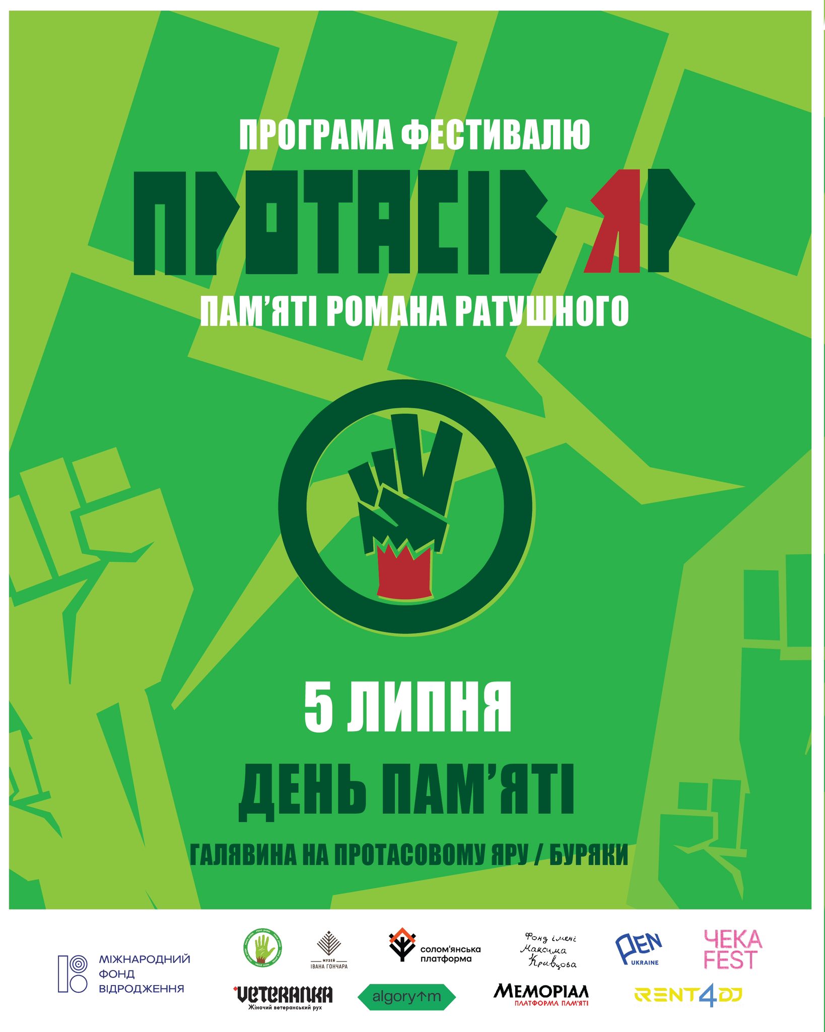 Друзі, вже цієї пʼятниці стартує третій фестиваль «Протасів Яр» памʼяті громадського активіста і розвідника 93-ї бригади “Холодний яр” Романа Ратушного. Триватиме з 4 по 6 липня на живописній галявині в серці Протасового Яру. Цей щорічний захід не лише вшановує пам’ять видатних українців, а й слугує потужною платформою для розвитку національної культури та громадянського суспільства.Основна мета фестивалю «Протасів Яр» — всебічна популяризація сучасного й традиційного українського мистецтва, глибоке осмислення нашої багатої історії та безкомпромісна підтримка правозахисних ініціатив. Ми продовжуємо справу Романа Ратушного, який присвятив своє життя захисту київських зелених зон, боротьбі за справедливість та суверенність України. Його ім’я стало символом незламності та відданості своїй Батьківщині. Фестиваль є нагадуванням про важливість активної громадянської позиції та збереження національної ідентичності.Цього року фестиваль «Протасів Яр» також присвячений світлій пам’яті брата Романа — Василя Ратушного, який, подібно до Романа, віддав своє життя за Україну, загинувши на фронті в лютому. Вшановуючи пам’ять обох героїв, ми не лише згадуємо їхній подвиг, а й підкреслюємо нерозривний зв’язок між культурним розвитком та обороною нашої держави. Їхня самопожертва є вічним джерелом натхнення для всіх українців.Фестиваль «Протасів Яр» запрошує долучитися до заходів, що будуть сповнені змісту та глибоких сенсів. Протягом трьох днів на гостей чекатимуть виступи видатних українських митців, дискусії на актуальні теми, присвячені історії та майбутньому України, а також інформаційні сесії щодо правозахисної діяльності. Це унікальна можливість не тільки доторкнутися до живого українського мистецтва, а й обговорити питання, що дійсно мають значення для нашої країни.Приходьте на фестиваль «Протасів Яр», щоб разом вшанувати пам’ять наших героїв. Кожна присутність є важливим свідченням поваги та єднання. Ми разом говоритимемо про важливе – про цінності, які об’єднують українську націю, про нашу спільну боротьбу за свободу та незалежність. Не пропустіть цю подію, що обіцяє бути насиченою та надихаючою. Долучайтесь до третього фестивалю пам’яті Романа та Василя Ратушних. Будемо раді бачити вас в Протасовому Яру з 4 по 6 липня. Детальну програму можна знайти на офіційній сторінці Фестиваль “Протасів Яр” памʼяті Романа Ратушного.