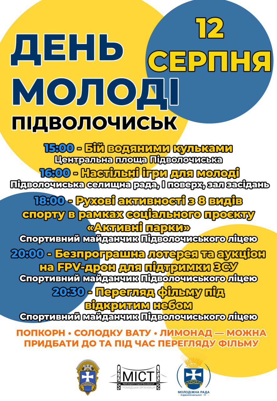 Друзі, запрошуємо вас на День Молоді в Підволочиську! 12 серпня проведемо разом неймовірний день, сповнений активностей та хорошого настрою!