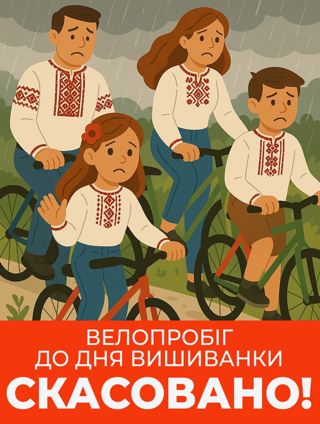 Друзі-велосипедисти! На жаль, мусимо повідомити, що запланований велопробіг громадою, присвячений Дню вишиванки, СКАСОВАНО через несприятливі погодні умови. Ми розуміємо ваше розчарування, але безпека учасників – наш пріоритет. Негода внесла свої корективи у наші плани.