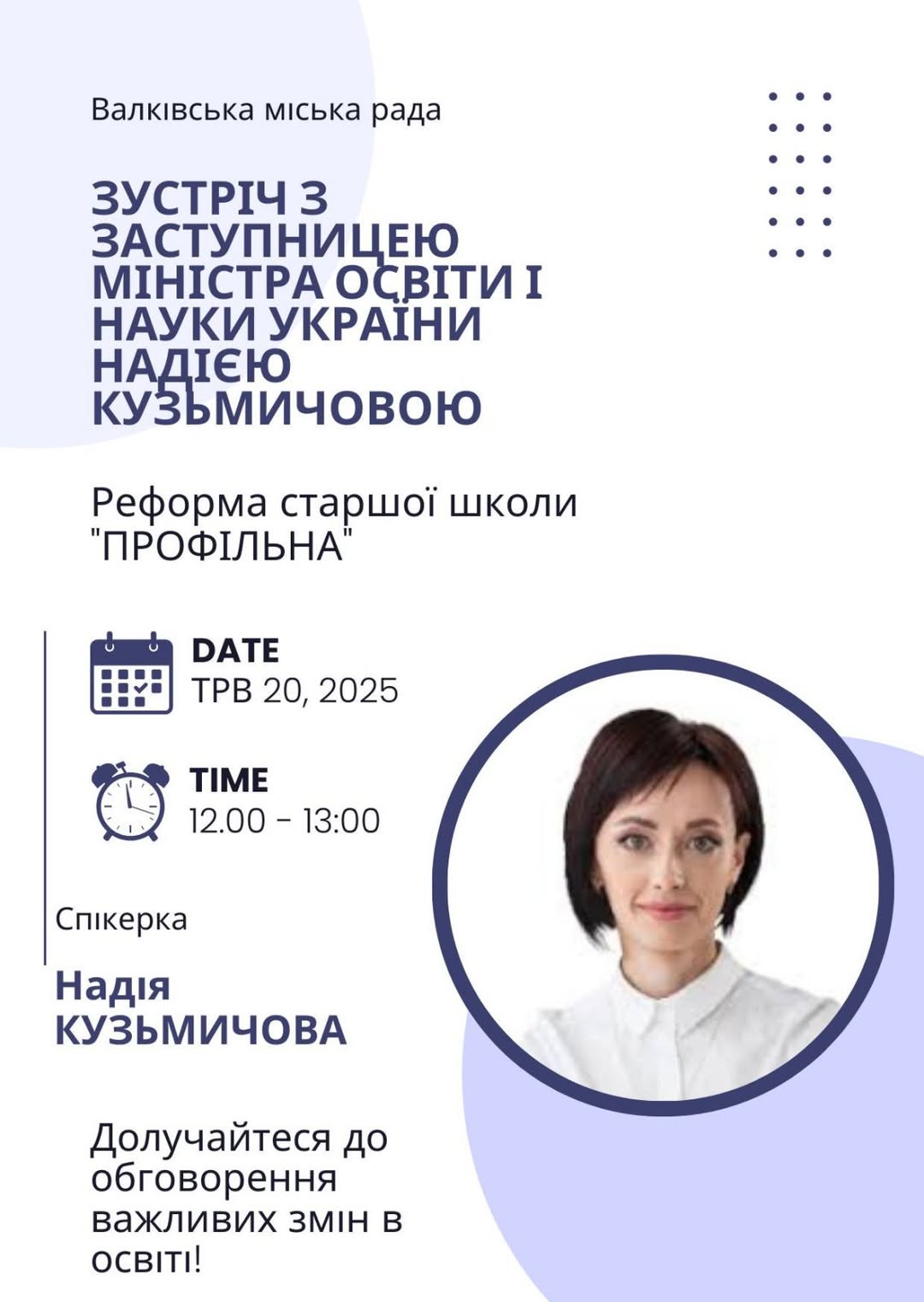 Друзі! Маємо чудову новину! Запрошуємо вас на онлайн-зустріч із заступницею міністра освіти і науки України Надією КУЗЬМИЧОВОЮ, яка присвячена ключовій реформі старшої школи – профільній освіті. Ця зустріч – чудова можливість дізнатися більше про зміни в освітній системі України.