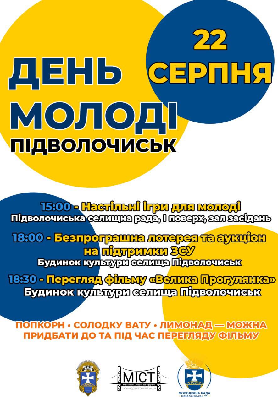 🇺🇦 **18:00 – Безпрограшна лотерея та благодійний аукціон.** Долучайтеся до доброї справи! Всі зібрані кошти підуть на придбання FPV-дрона для підтримки наших Збройних Сил України. Місце проведення: Будинок культури селища Підволочиськ.
