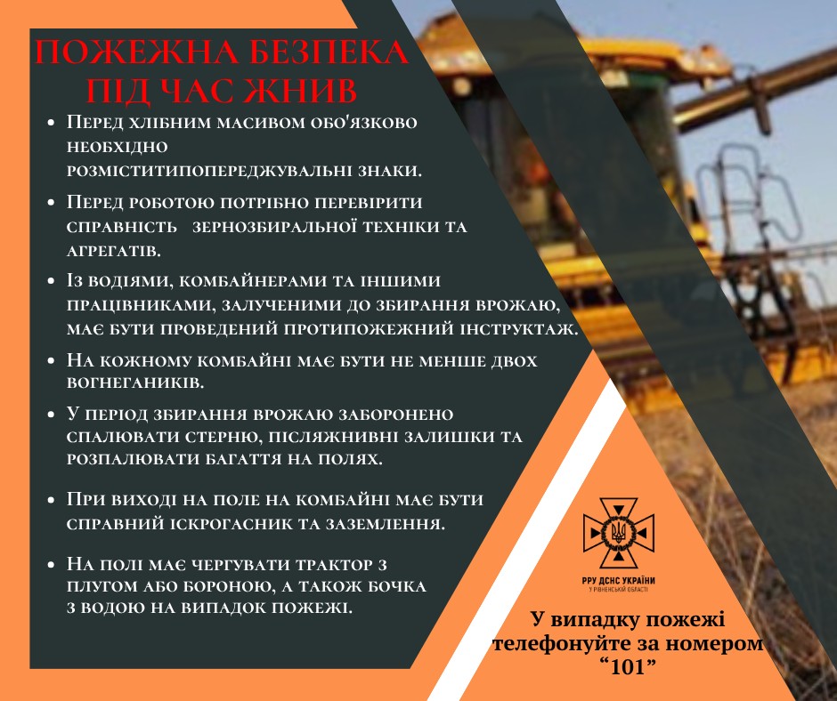 🚨Шановні громадяни! У період жнив потрібно особливо пильно слідкувати за дотриманням усіх правил протипожежної безпеки, щоб вберегти урожай та нашу землю від пожеж!