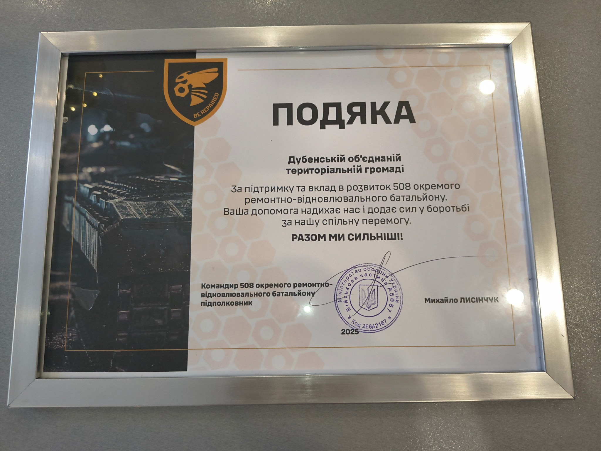 Міський голова Дубна, Василь Антонюк, днями отримав почесні нагороди від українських захисників – подяку та бойовий прапор 508-го окремого ремонтно-відновлювального батальйону. Командування та особовий склад військової частини висловили глибоку вдячність громаді Дубна за надану допомогу та незмінну підтримку. Ця підтримка є надзвичайно важливою для ефективного виконання бойових завдань підрозділу та захисту суверенітету й територіальної цілісності нашої держави. Загалом, від Дубенської громади на забезпечення потреб 508-го батальйону було спрямовано 310 тисяч гривень. Ці кошти були цільово використані на ремонт та обслуговування військової та спеціалізованої техніки, що є критично важливим для підтримки боєздатності підрозділу.