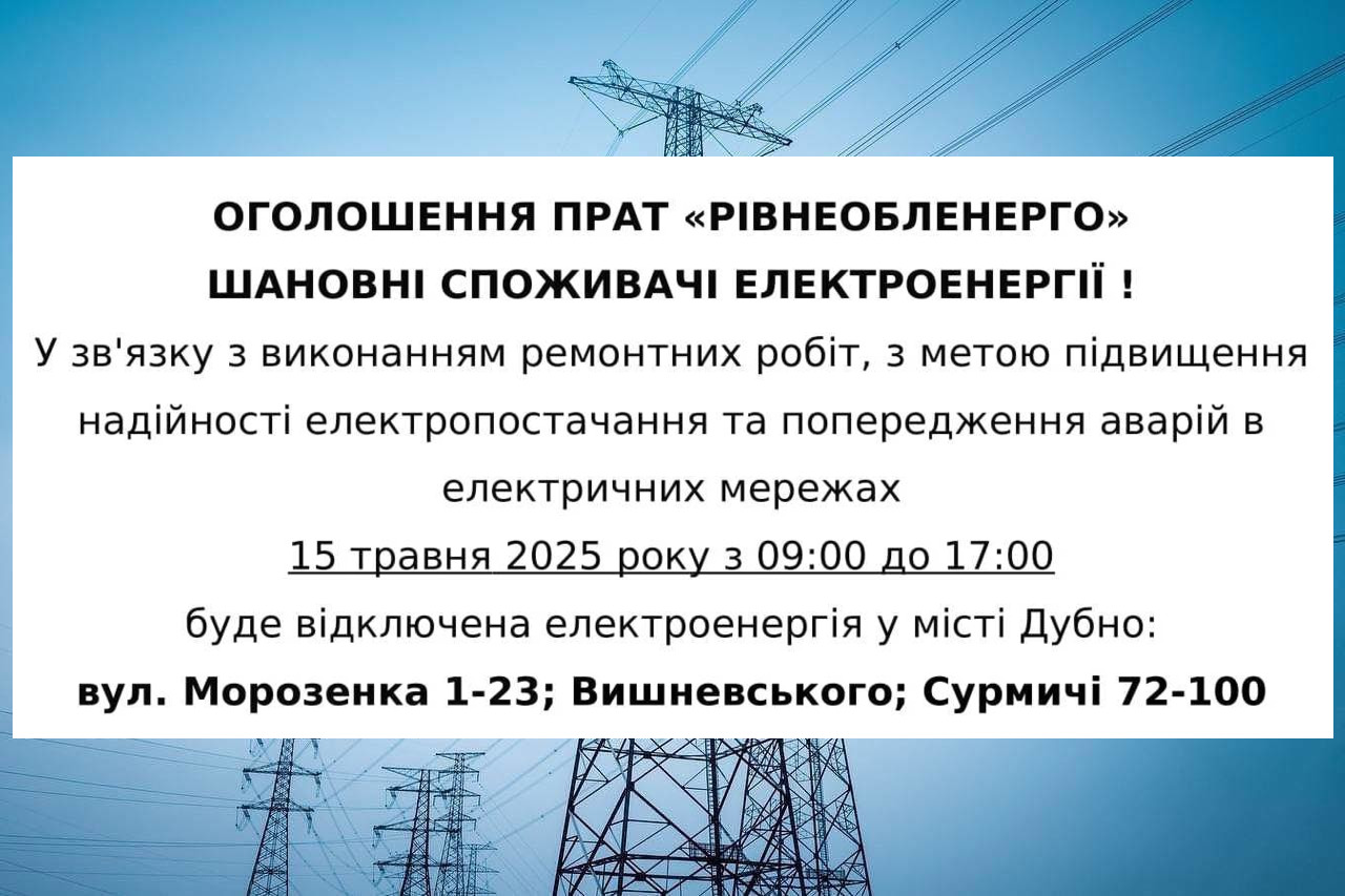 Ключові слова: відключення електроенергії Дубно, Рівнеобленерго, ремонтні роботи, електропостачання Дубно, відключення світла, Дубно новини, електромережі, Морозенка, Вишневського, Сурмичі.