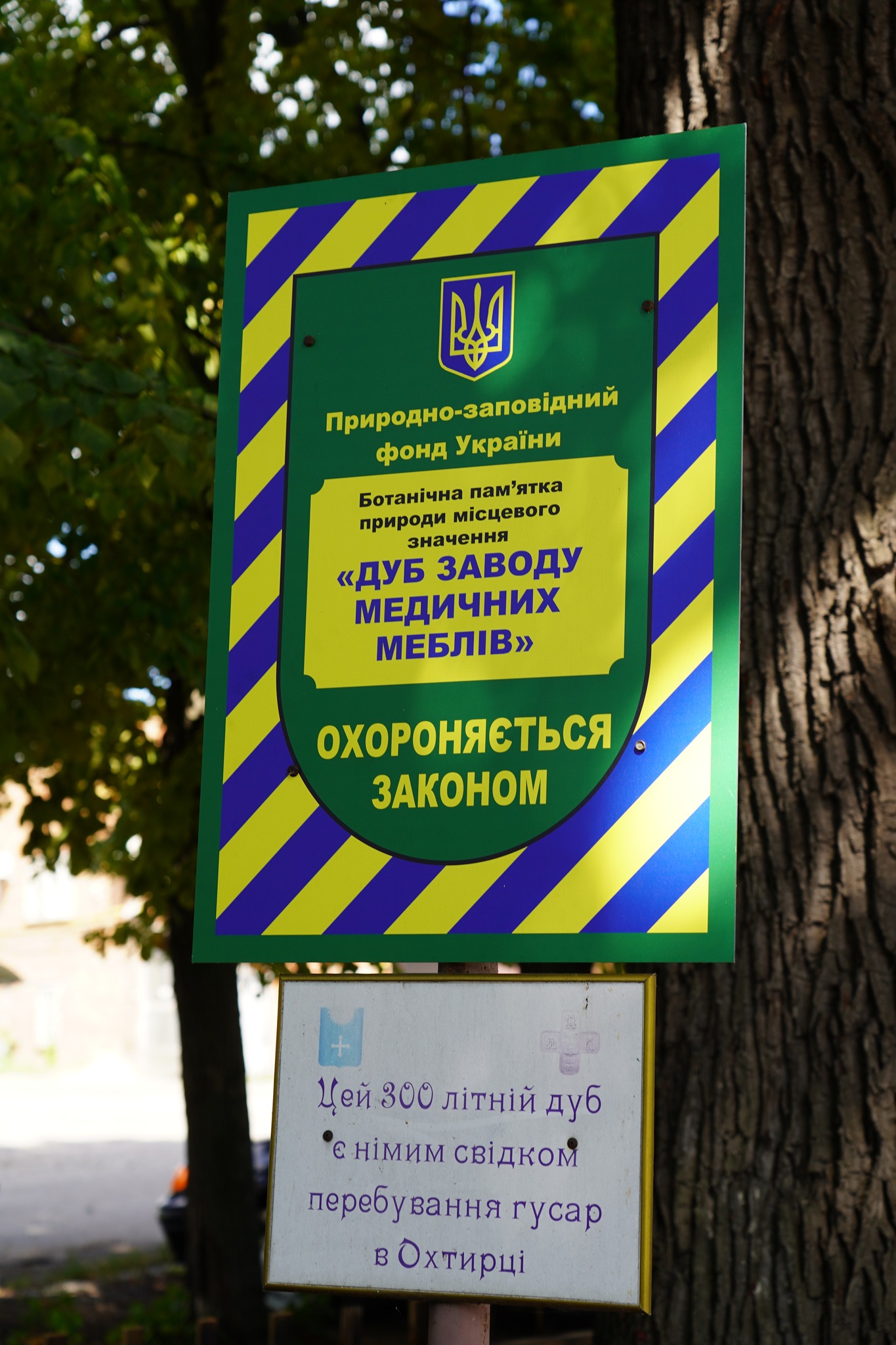 🔰 В Охтирці ж одним із найстаріших є унікальний «гусарський» дуб, що росте на території колишнього заводу медичних меблів. Цей понад 350-річний велетень, висотою 29 м та обхватом стовбура 3,95 м, пов’язаний з історією Охтирського гусарського полку.