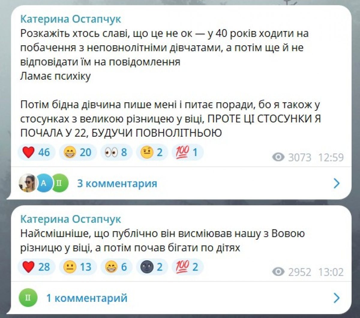 Цікаво, що Катерина Полтавська раніше вже висловлювала свою думку щодо Дьоміна, зокрема, критикуючи його за певну поведінку, пов’язану з побаченнями з неповнолітніми. Вона стверджувала, що їй писала дівчина, яка шукала поради стосовно Слави, оскільки він не виходив на зв’язок. Однак, інтерв’юер категорично заперечує ці звинувачення. Дьомін наполягає, що Полтавська використала цю історію, аби продемонструвати свою образу на нього.
