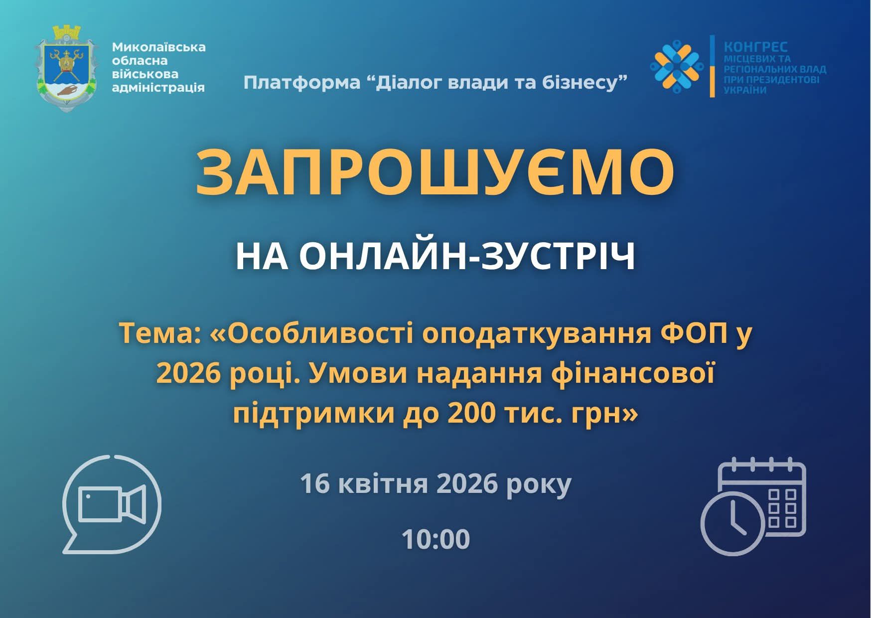 У рамках регіональної платформи комунікації «Діалог влади та бізнесу» запрошуємо представників бізнесу Миколаївщини взяти участь в онлайн-зустрічі, яка відбудеться 16 квітня 2026 року о 10:00 на тему: «Особливості оподаткування ФОП у 2026 році. Умови надання фінансової підтримки до 200 тис. грн».
