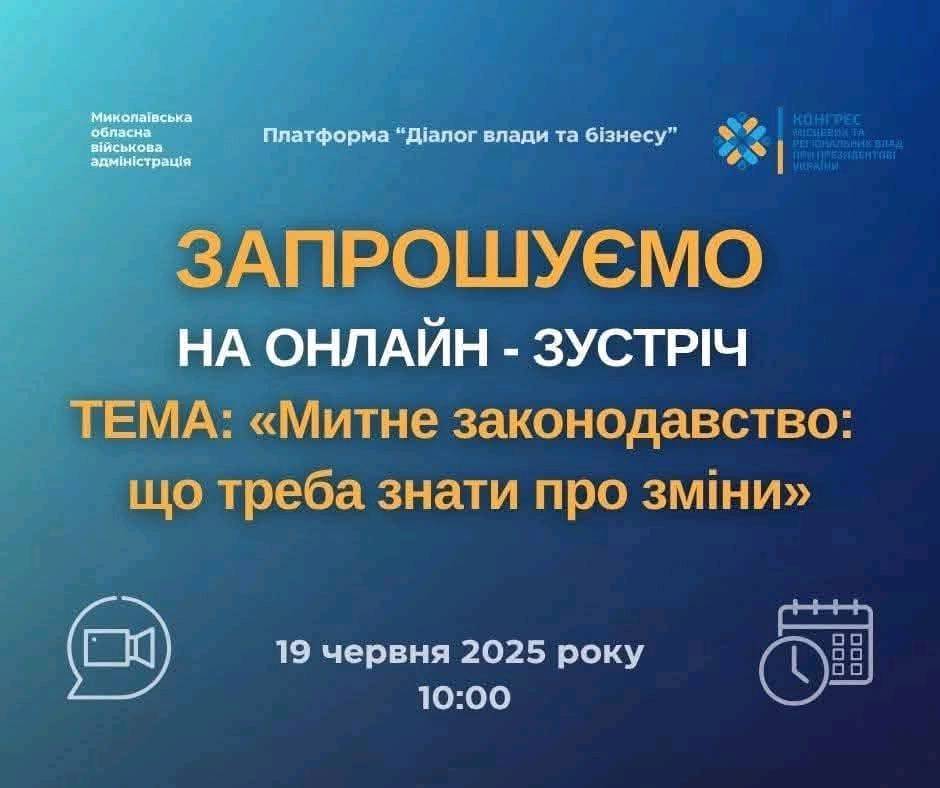 Запрошуємо представників бізнесу Миколаївської області взяти участь у важливій онлайн-зустрічі, присвяченій актуальним змінам у митному законодавстві. Ця подія – чудова нагода для діалогу влади та бізнесу, де ви зможете безпосередньо поставити свої запитання представникам Миколаївської митниці та отримати вичерпні відповіді щодо всіх аспектів митного законодавства та пов’язаних питань.