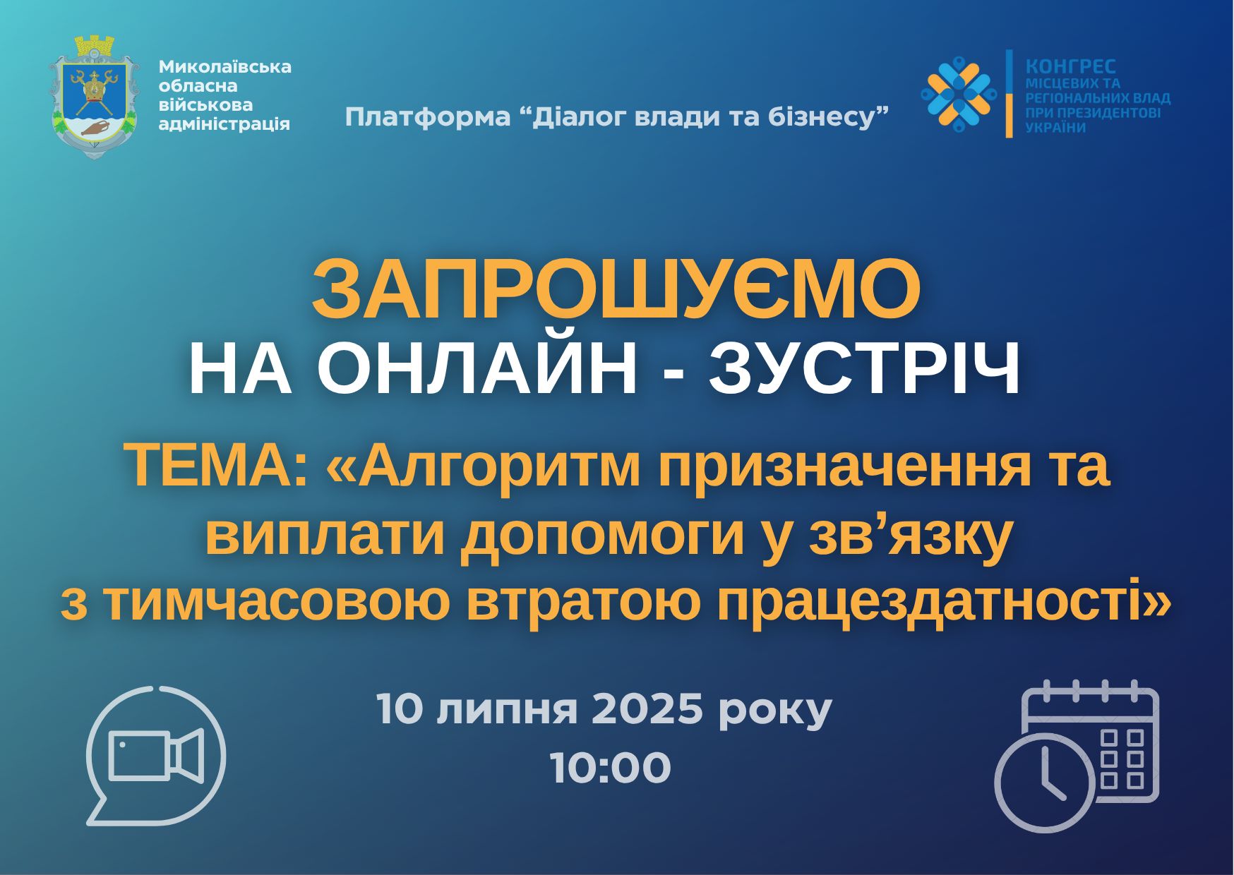 Шановні представники бізнесу! Продовжуємо важливий діалог між владою та підприємцями, запрошуючи вас взяти участь в ексклюзивній онлайн-зустрічі. Цей захід присвячений одній з найактуальніших тем для роботодавців та їхніх працівників: «Алгоритм призначення та виплати допомоги у зв’язку з тимчасовою втратою працездатності». Розуміння всіх нюансів цього процесу є критично важливим для належного функціонування будь-якого підприємства та забезпечення соціального захисту робітників. Зустріч відбудеться у четвер, 10 липня, о 10:00. Це чудова нагода отримати вичерпні відповіді на ваші запитання безпосередньо від кваліфікованих представників Головного управління Пенсійного фонду України в Миколаївській області. Тема допомоги при тимчасовій втраті працездатності постійно викликає багато питань, і ця зустріч стане платформою для їх вирішення. Під час цієї інформативної онлайн-сесії ви зможете детально обговорити та поставити свої питання щодо порядку оформлення лікарняних листків, що є основою для нарахування допомоги. Будуть роз’яснені особливості подачі електронних заяв-розрахунків, що значно спрощує процедуру для сучасного бізнесу. Крім того, спікери нададуть вичерпну інформацію щодо строків призначення та виплати допомоги у зв’язку з тимчасовою втратою працездатності, що дозволить вам ефективніше планувати фінансові потоки та дотримуватися всіх встановлених термінів. Особливу увагу буде приділено можливим змінам у законодавстві, які безпосередньо впливають на роботодавців та працівників. Ми знаємо, наскільки важливо бути в курсі всіх нововведень, щоб уникнути непорозумінь та забезпечити відповідність діючим нормам. Це дозволить вашому бізнесу працювати злагоджено та без ризиків. Допомога у зв’язку з тимчасовою втратою працездатності – це не просто виплата, а складна система, що потребує глибоких знань. Ця онлайн-зустріч є унікальною можливістю для підприємців Миколаївської області та всієї України, які прагнуть поглибити свої знання у сфері соціального забезпечення. Ви зможете задати свої конкретні питання та отримати професійні консультації, що допоможе вам уникнути типових помилок та оптимізувати процеси, пов’язані з виплатами. Наші експерти готові поділитися актуальною інформацією та роз’яснити всі аспекти, що стосуються лікарняних та допомоги при тимчасовій втраті працездатності. Реєстрація на зустріч є обов’язковою та доступна за посиланням: https://forms.gle/vdrPJShTmbwAa8g26. Після успішної реєстрації посилання для приєднання до Zoom-конференції буде надіслано на вашу електронну пошту. Не пропустіть нагоду покращити свої знання та забезпечити стабільність вашого бізнесу у питаннях, що стосуються допомоги у зв’язку з тимчасовою втратою працездатності та інших соціальних гарантій. Чекаємо на вас!
