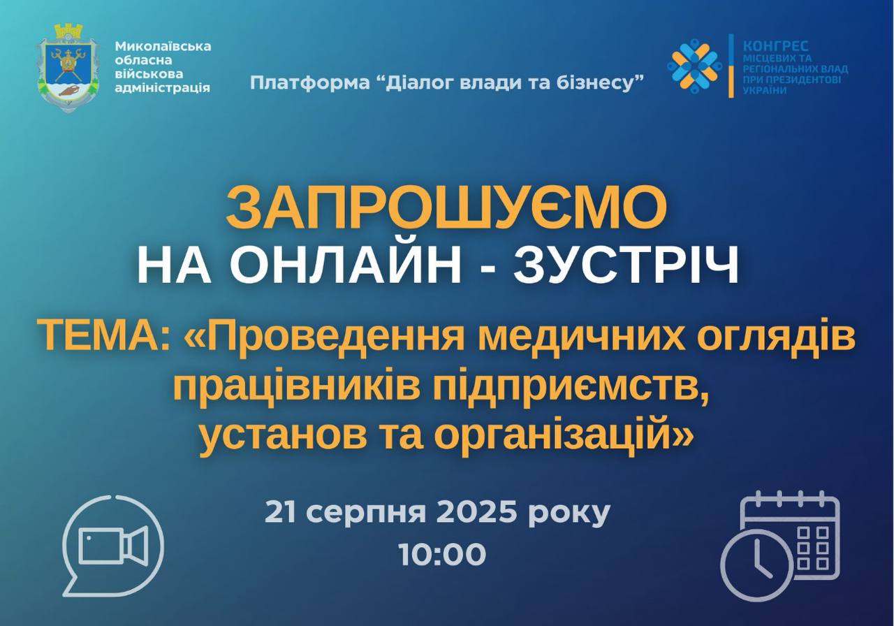 ✅ “Діалог влади та бізнесу” триває: запрошуємо представників бізнесу взяти участь в онлайн-зустрічі на тему: «Проведення медичних оглядів працівників підприємств, установ та організацій». Ця зустріч є важливою платформою для обміну думками та вирішення нагальних питань, що стосуються охорони праці та здоров’я в сучасному трудовому середовищі. Наша мета – забезпечити ефективну взаємодію між державними органами та бізнес-спільнотою для створення безпечних та здорових умов праці на всіх підприємствах України.