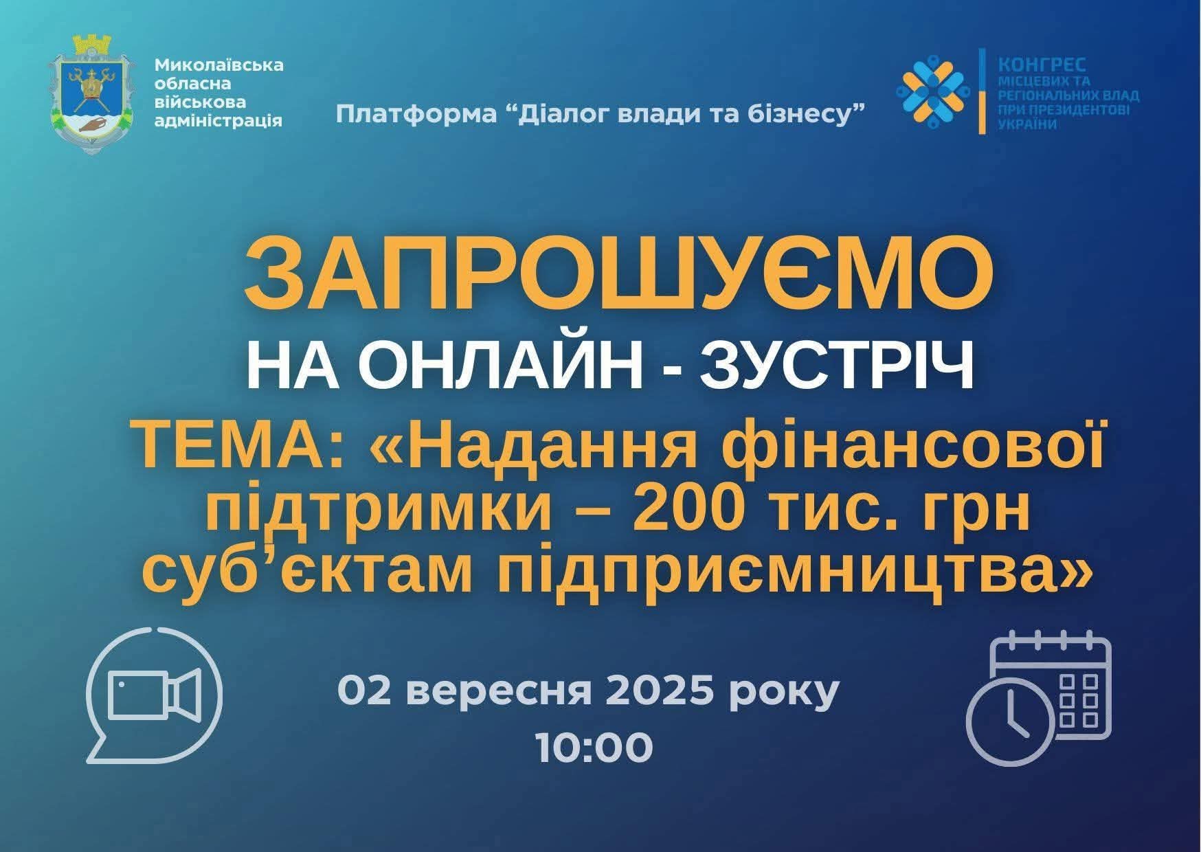✅ «Діалог влади та бізнесу» продовжується: запрошуємо підприємців Миколаївщини долучитися до важливої онлайн-зустрічі, присвяченої темі «Надання фінансової підтримки – 200 тис. грн суб’єктам підприємництва». Ця ініціатива є частиною постійного діалогу між представниками влади та бізнесу, спрямованого на покращення умов ведення підприємницької діяльності в регіоні.