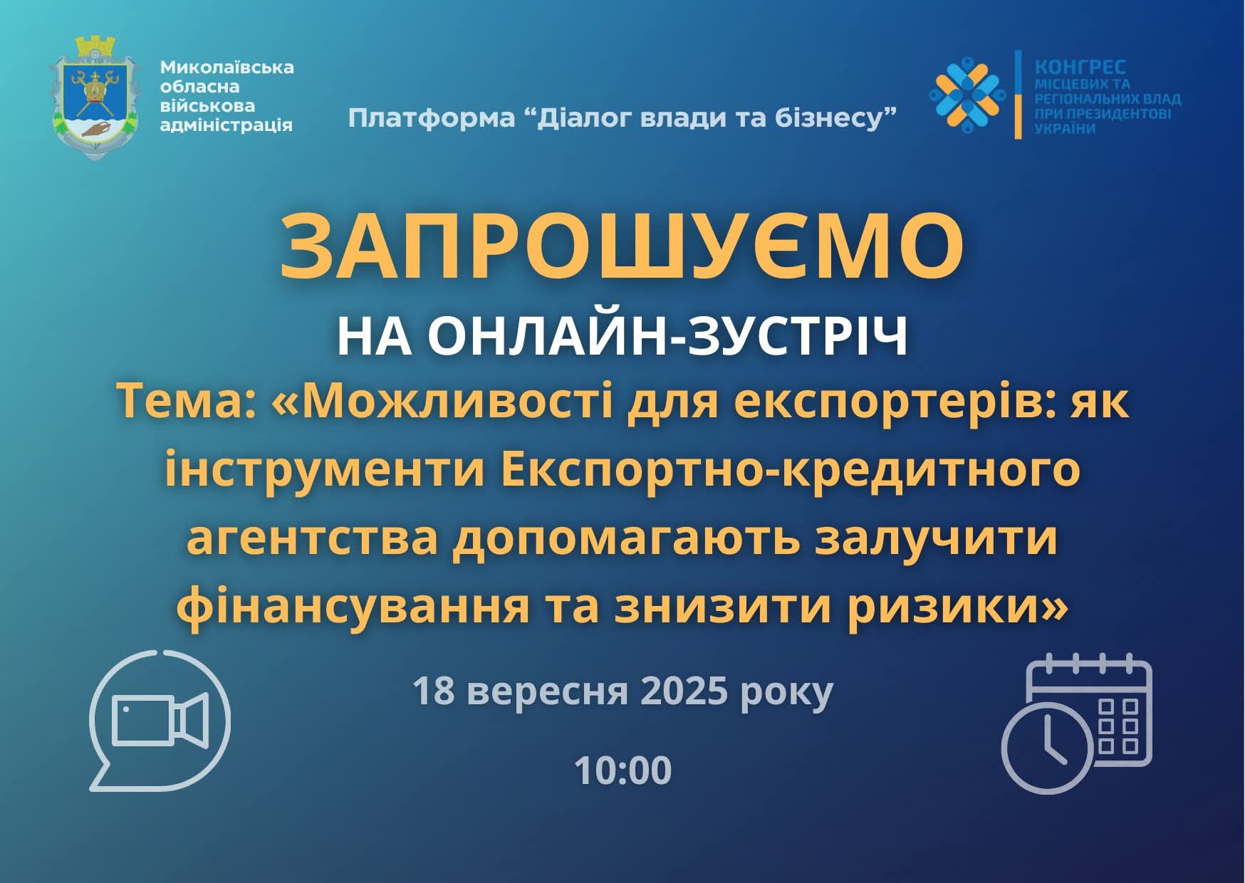«Діалог влади та бізнесу» триває: запрошуємо представників бізнесу взяти участь в онлайн-зустрічі на тему: «Можливості для експортерів: як інструменти Експортно-кредитного агентства допомагають залучити фінансування та знизити ризики». Ця зустріч є чудовою нагодою для підприємців дізнатися про актуальні механізми підтримки їхньої зовнішньоекономічної діяльності.