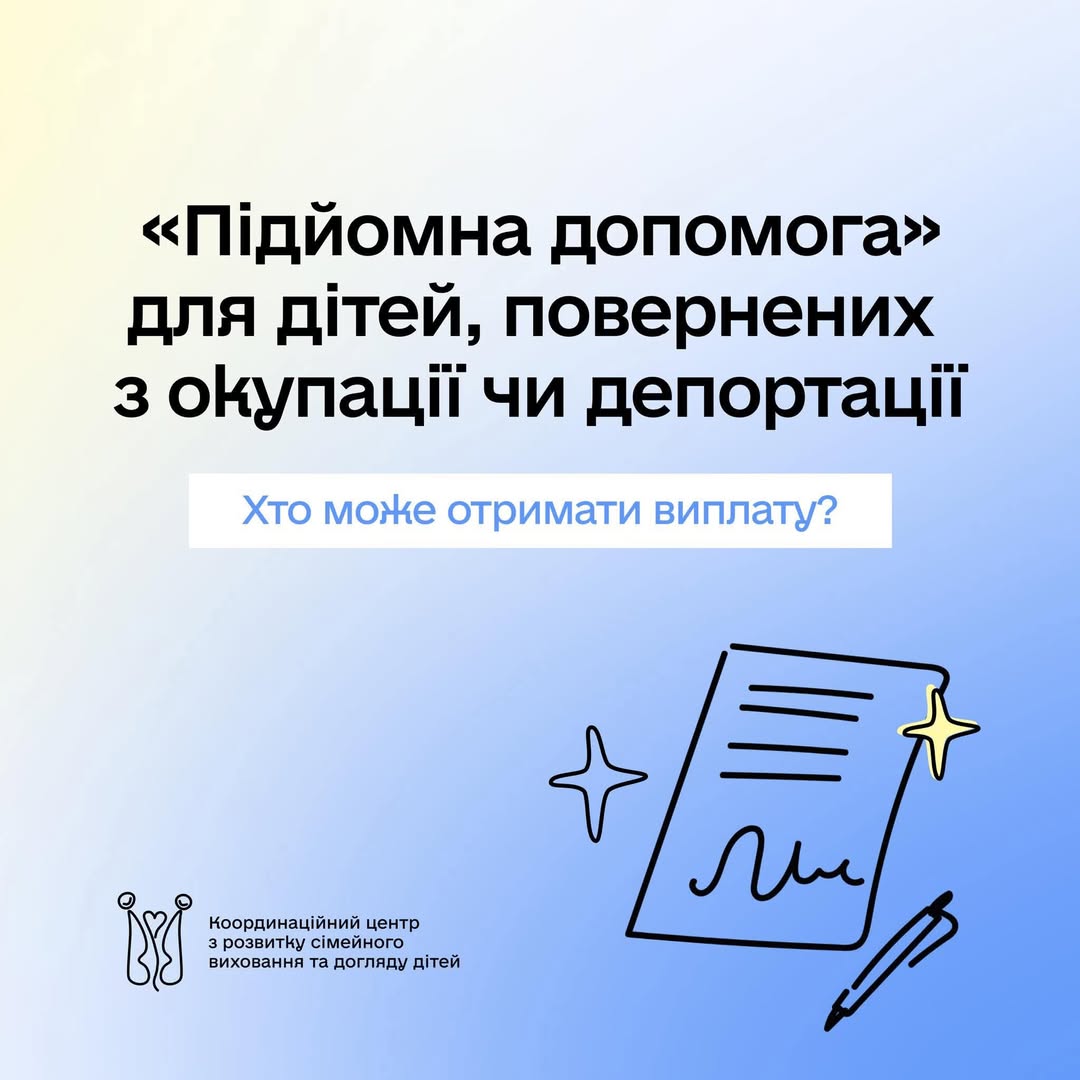 📄 Виплата підйомної допомоги була запроваджена у червні 2025 року. Початково вона надавалася лише дітям, яких держава повернула з окупації чи депортації у супроводі уповноважених осіб. Проте, з 1 жовтня 2025 року, коло отримувачів було розширено. Тепер така допомога надається не лише дітям, поверненим за сприяння держави та громадських організацій, а й тим, хто повернувся власними силами, що значно розширює доступ до цієї важливої програми.