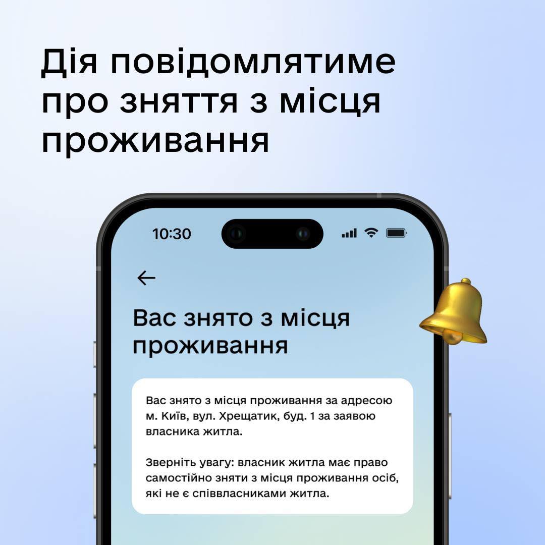 Тепер ви завжди будете знати, якщо вас знімуть з місця проживання! Раніше, зняття з місця проживання могло відбутися без вашого відома, і ви могли дізнатися про це лише через роки. Але зараз, завдяки інтеграції з Дією, все змінилося. Якщо власник вирішить «виписати» вас з квартири чи будинку, Дія негайно надішле вам відповідне сповіщення. Це значно підвищує прозорість та контроль над вашими персональними даними.