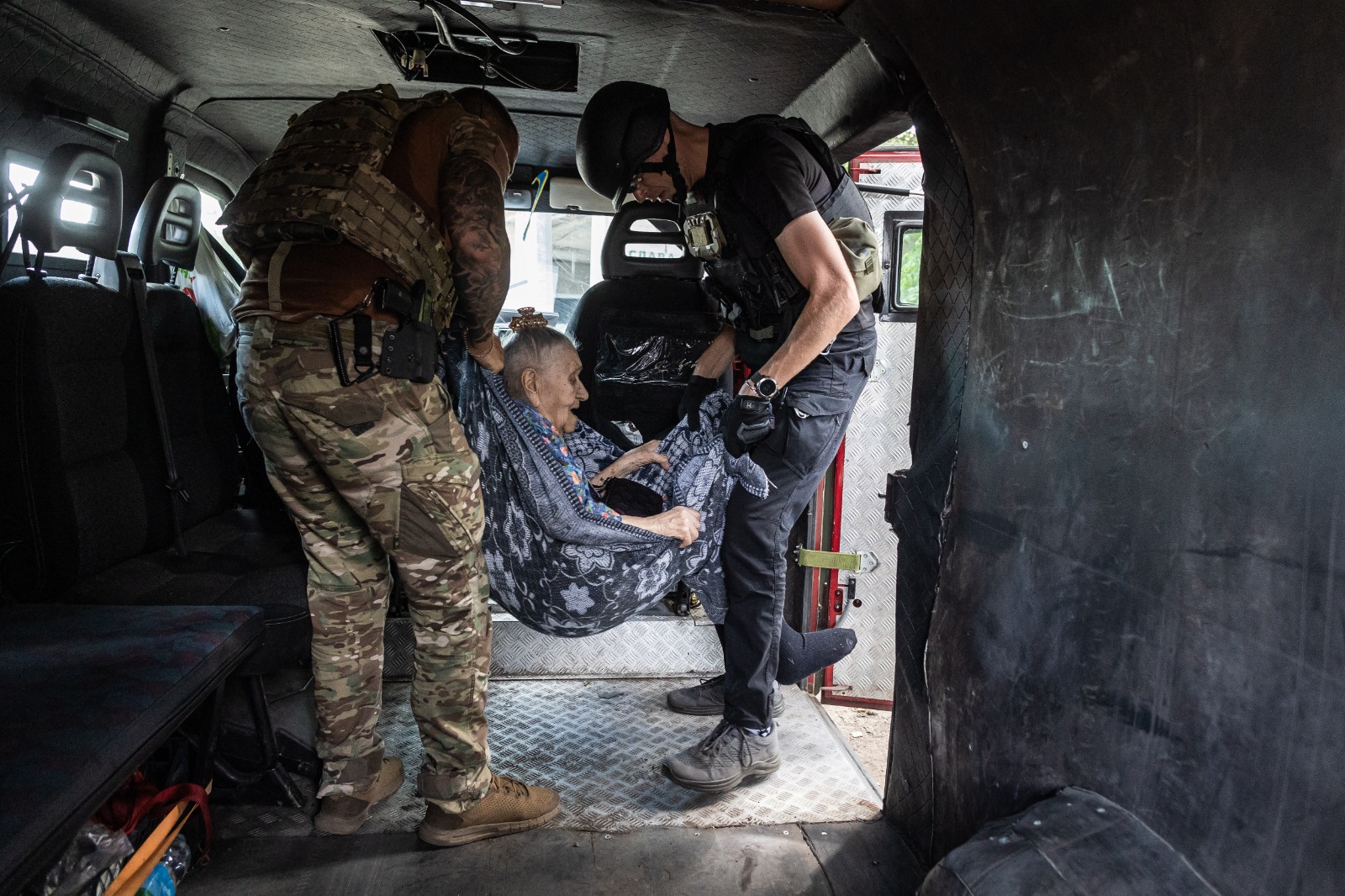 Евакуація з прифронтового міста – це завжди співпраця і точна координація. Часто вона проходить у два етапи. На цих фото – евакуаційна місія спеціального підрозділу поліції «Білий Янгол». На броньованому транспорті вони забрали людей із небезпечної Костянтинівки і вивезли їх до точки стикування – це перший етап.