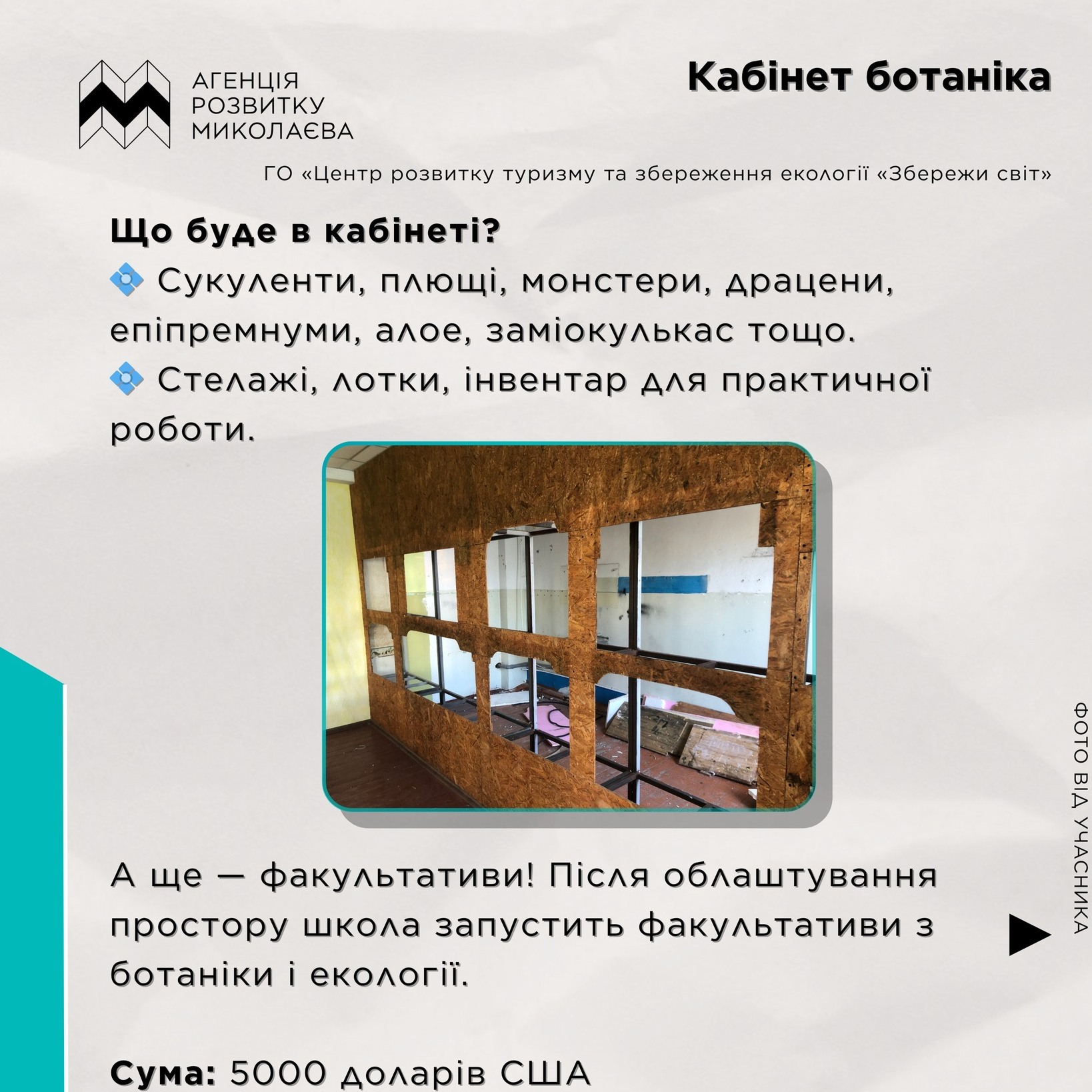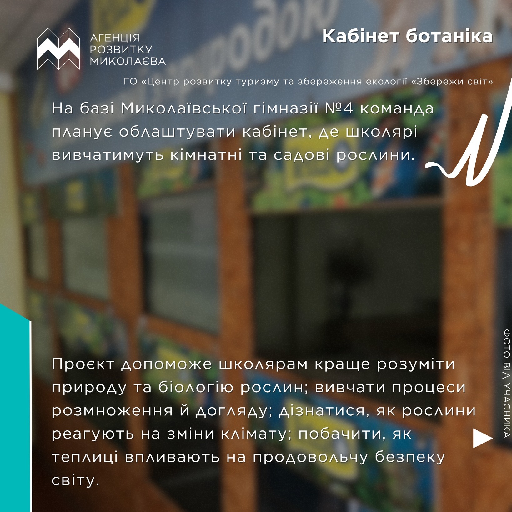 🪴 Кабінет ботаніка — облаштування у Миколаївській міській гімназії №4 кабінету з вивчення кімнатних та садових рослин. Школярі зможуть більш практично вивчати процеси розвитку, розмноження та захисту рослин проти шкідників й хвороб.