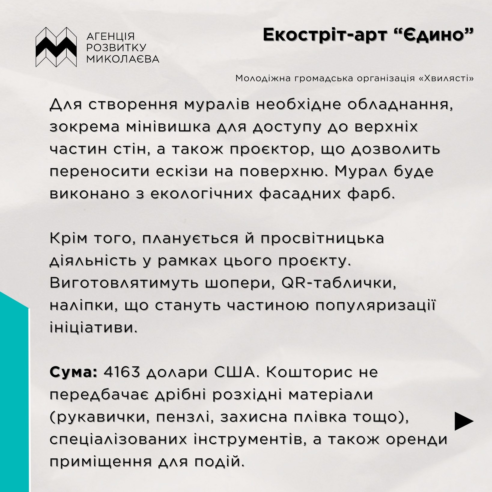 🎨 Екостріт-арт «Єдино» — створення п’яти муралів з екологічними меседжами у публічному просторі Миколаєва. Їх розробляє та малює молодь (ескізи погоджені з організаторами). Мета — привернути увагу до змін клімату, свідомого споживання та стану довкілля.
