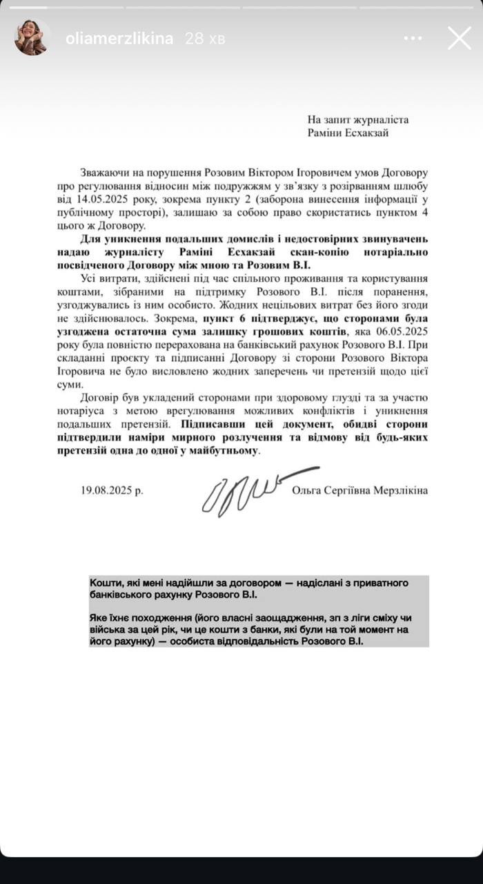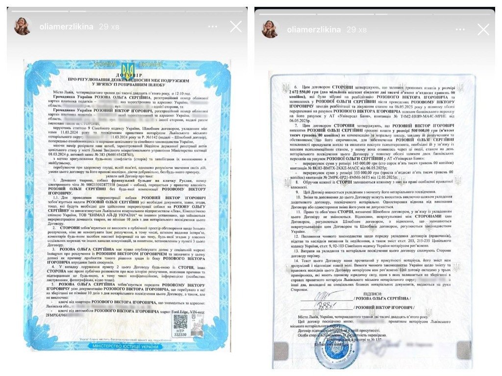 Договір, який підписали Ольга Мерзлікіна та Віктор Розовий / © instagram.com/oliamerzlikina