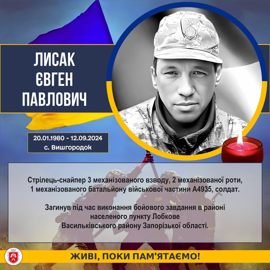 Трагічно, але героїчно, Євген Лисак загинув 12 вересня 2024 року. Він виконував бойове завдання в районі населеного пункту Лобкове, що на Василівщині Запорізької області. Отримані поранення виявилися несумісними з життям. Його жертва – це внесок у нашу перемогу, у наше майбутнє.