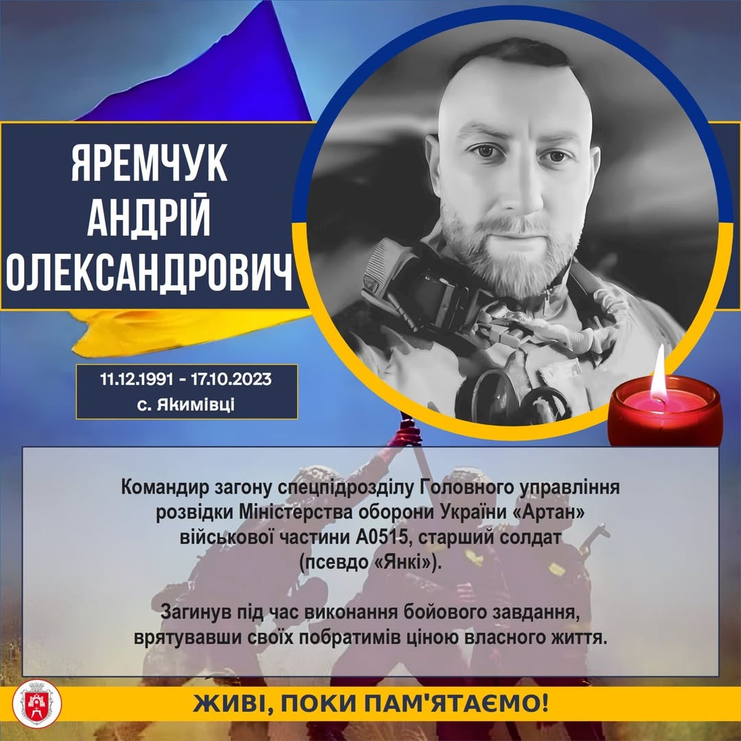 Сьогодні, 17-го жовтня, минає друга річниця від дня загибелі Героя Андрія Яремчука. Цей день нагадує нам про ціну, яку платить Україна за свою свободу, і про подвиги тих, хто став на захист Батьківщини. Андрій Яремчук – один із тих, чия жертва ніколи не буде забута.