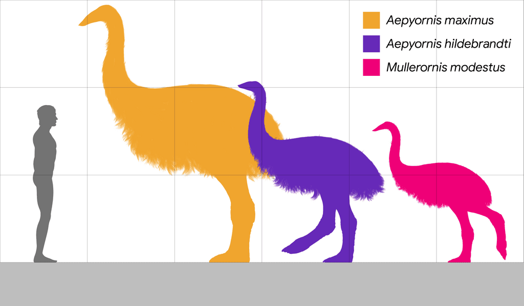 Порівняння розмірів трьох видів слонових птахів у порівнянні з людиною