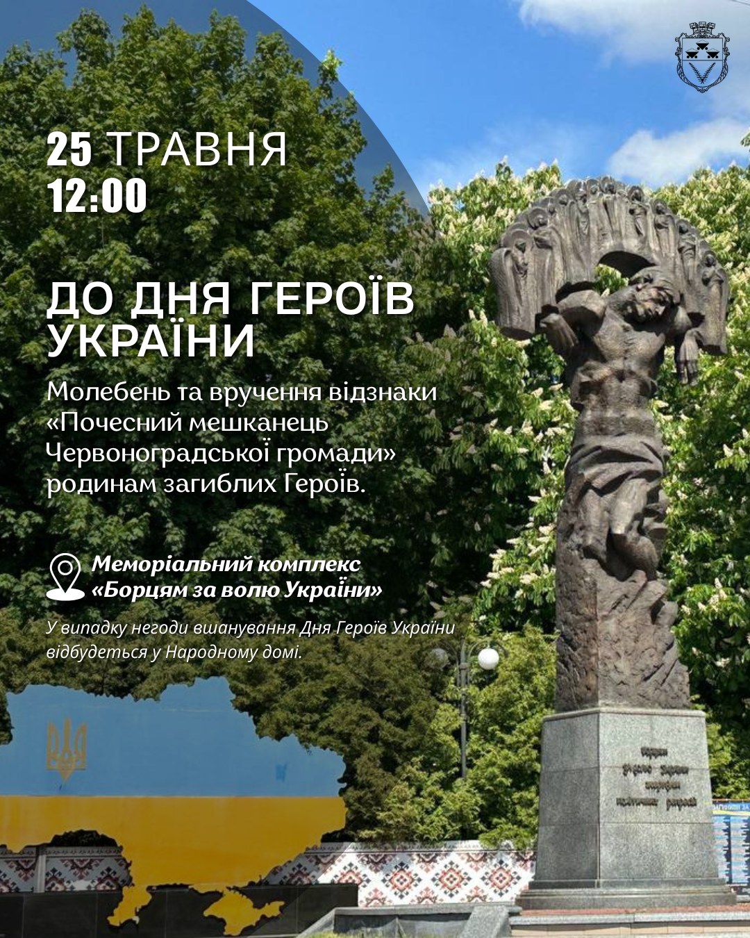 Завтра, о 12:00, біля Меморіального комплексу «Борцям за волю України» в Червонограді відбудеться урочистий молебень з нагоди Дня Героїв України. Під час заходу планується вручення відзнаки «Почесний мешканець Червоноградської громади» родинам загиблих Героїв, які віддали своє життя за свободу та незалежність нашої держави.