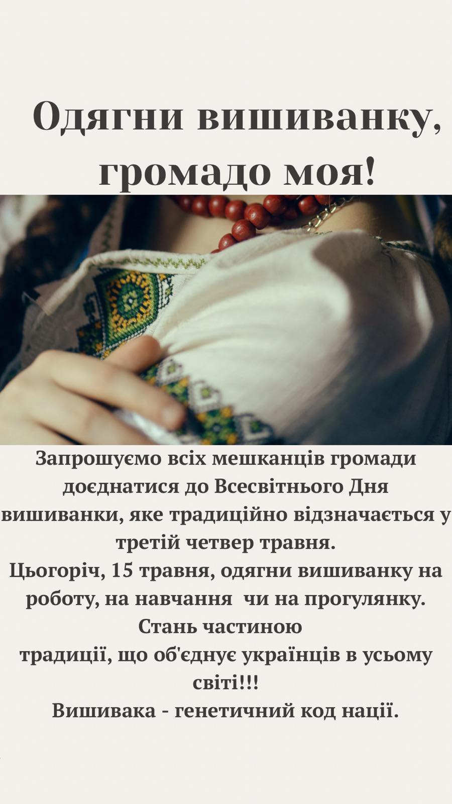 Завтра, 15 травня, ми відзначаємо День вишиванки! Це чудова нагода продемонструвати нашу національну ідентичність та єдність. День вишиванки – це не просто свято, це символ української культури, нашої багатої історії та незламного духу.