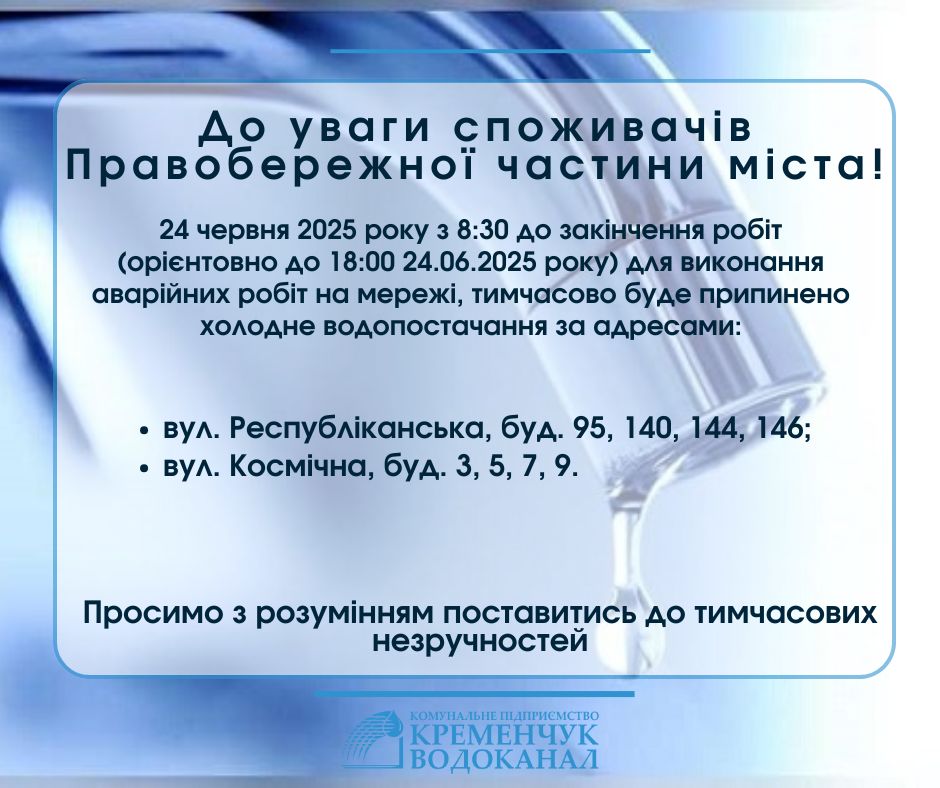 Повідомлення КП «Кременчукводоканал»: Тимчасове відключення водопостачання на Правобережжі Кременчука Завтра, 24 червня, мешканці Правобережжя Кременчука зіткнуться з тимчасовим призупиненням централізованого водопостачання. Це планові роботи, які здійснюватимуть працівники комунального підприємства «Кременчукводоканал» на водопровідній мережі міста. Ці заходи є частиною важливого комплексу робіт з технічного обслуговування та покращення інфраструктури, що забезпечує надійне водопостачання для тисяч домогосподарств. Ремонтні роботи є необхідною умовою для підтримання системи водопостачання у належному стані, запобігання аварійним ситуаціям у майбутньому та забезпечення стабільного функціонування мережі. Відключення водопостачання на Правобережжі є тимчасовим незручністю, спрямованою на довгострокову вигоду для всіх споживачів. З огляду на майбутнє відключення водопостачання, КП «Кременчукводоканал» наполегливо рекомендує всім мешканцям Правобережжя заздалегідь подбати про необхідний запас питної та побутової води. Наявність достатнього запасу води допоможе мінімізувати незручності протягом періоду виконання робіт. Важливо пам’ятати, що такі профілактичні та ремонтні дії є критично важливими для підтримки стабільності та якості послуг з водопостачання. Мешканці Кременчука мають бути готовими до змін у графіку подачі води. Після успішного завершення всіх запланованих ремонтних робіт централізоване водопостачання буде повністю відновлено. Однак, варто врахувати, що одразу після відновлення можливе короткочасне збільшення каламутності та забарвленості води. Це нормальне явище, пов’язане з процесом заповнення труб після зливу води та може бути спричинене відкладеннями, що піднімаються з дна труб під час відновлення тиску. Рекомендується на деякий час залишити кран відкритим, щоб вода протекла і стала прозорою. Зазвичай, це питання вирішується протягом короткого періоду часу, і якість води повертається до норми. Мешканці Правобережжя повинні бути готові до цієї тимчасової особливості водопостачання. Для отримання будь-якої оперативної інформації щодо ходу ремонтних робіт, а також для уточнення деталей щодо відновлення водопостачання або вирішення інших питань, пов’язаних з водопостачанням у Кременчуці, мешканці можуть звертатись до диспетчерської служби КП «Кременчукводоканал». Телефони для зв’язку: 050-305-45-71 та 067-403-97-86. Фахівці служби готові надати вичерпні відповіді та допомогти у вирішенні виникаючих проблем. Це важлива інформація для всіх, кого торкнеться тимчасове відключення водопостачання. Просимо врахувати всі рекомендації та повідомлення комунальних служб для комфортного переживання періоду без води. КП «Кременчукводоканал» дякує за розуміння та співпрацю.