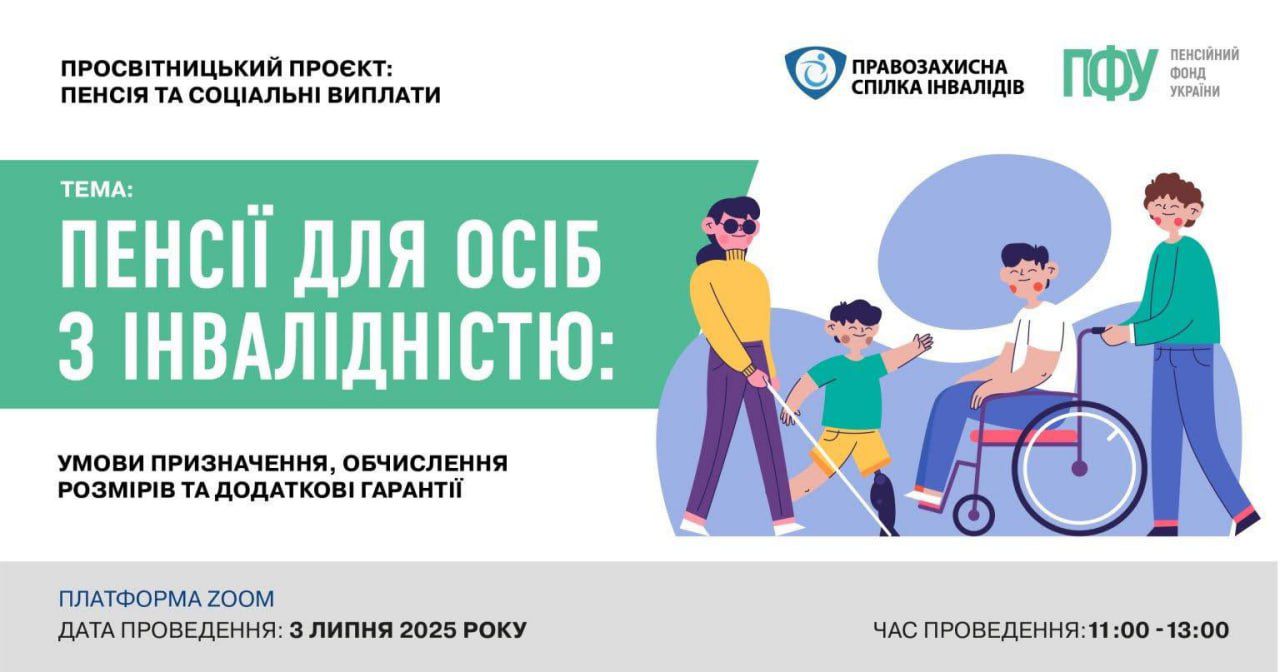 Шановні громадяни та всі, хто цікавиться соціальним захистом в Україні! Важлива подія, що стосується однієї з найактуальніших тем – пенсійного забезпечення для осіб з інвалідністю – анонсована до проведення. Всеукраїнська громадська організація інвалідів «Правозахисна спілка інвалідів» у тісній співпраці з Пенсійним фондом України, а також за підтримки громадської організації «Національна асоціація спинальників України», запрошують усіх бажаючих долучитися до унікального онлайн-семінару. Цей захід організовано в рамках широкомасштабного просвітницького проєкту під назвою «Пенсія та соціальні виплати», який має на меті підвищити рівень обізнаності населення щодо своїх прав та можливостей у сфері соціального забезпечення.Семінар «Пенсії для осіб з інвалідністю – що важливо знати» стане незамінним джерелом інформації для багатьох категорій населення. Програма заходу ретельно продумана та включає в себе ключові аспекти, що викликають найбільше запитань у громадян. Зокрема, буде надано вичерпні роз’яснення щодо умов призначення пенсій для осіб з інвалідністю. Це охоплює критерії, необхідні документи, процедури звернення та інші важливі нюанси, які допоможуть зрозуміти, хто і за яких обставин може розраховувати на отримання таких виплат.Окрім цього, значна увага буде приділена особливостям обчислення розмірів пенсій. Учасники дізнаються, які фактори впливають на розмір пенсійних виплат, як враховується трудовий стаж, група інвалідності та інші показники, що формують остаточну суму пенсії. Це надзвичайно важлива інформація, адже правильне розуміння механізмів обчислення дозволяє уникнути можливих помилок та забезпечити справедливе нарахування.Не менш важливим блоком семінару стане розгляд додаткових соціальних гарантій, передбачених законодавством України для осіб з інвалідністю. Часто люди не знають про всі можливості та підтримку, на яку вони мають право, окрім основної пенсії. Йтиметься про пільги, компенсації, послуги та інші форми державної підтримки, що спрямовані на покращення якості життя та соціальної інтеграції осіб з інвалідністю.Захід заплановано на 3 липня 2025 року, що дає достатньо часу для попередньої реєстрації та підготовки. Семінар відбудеться в онлайн-форматі на платформі Zoom, що робить його доступним для широкої аудиторії по всій Україні, незалежно від місця проживання. Початок о 11:00, тривалість – до 13:00. Такий формат дозволяє учасникам долучитися до освітньої події, не виходячи з дому, що є особливо зручним для осіб з обмеженими фізичними можливостями.Для участі в семінарі обов’язкова попередня реєстрація за посиланням: https://forms.gle/ei1VsNk7beEMBgoa8. Це дозволить організаторам коректно спланувати захід та забезпечити доступ усіх зареєстрованих учасників. Посилання для безпосереднього доступу до семінару на платформі Zoom буде надано зареєстрованим учасникам: https://us06web.zoom.us/j/85478118164…Цей онлайн-семінар буде корисним для широкого кола осіб. Насамперед, це, звичайно, люди з інвалідністю, які безпосередньо зацікавлені у вивченні питань свого пенсійного забезпечення. Також запрошуються члени їхніх родин, адже розуміння пенсійної системи допомагає ефективніше підтримувати своїх близьких. Соціальні працівники, активісти громадських організацій та волонтери, які працюють у сфері соціального за