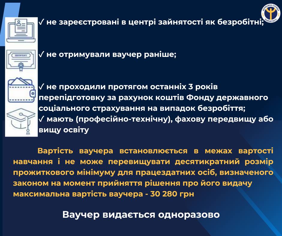 Отримати ваучер можуть особи, які мають професійну (професійно-технічну), фахову передвищу або вищу освіту та не є безробітними.