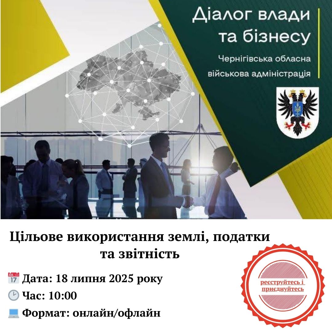У рамках ініціативи Президента України 🇺🇦 «Діалог влади та бізнесу» відбудеться онлайн-зустріч 18 липня о 10:00. Обговоримо важливі теми: земельне використання, податки та звітність. 📊