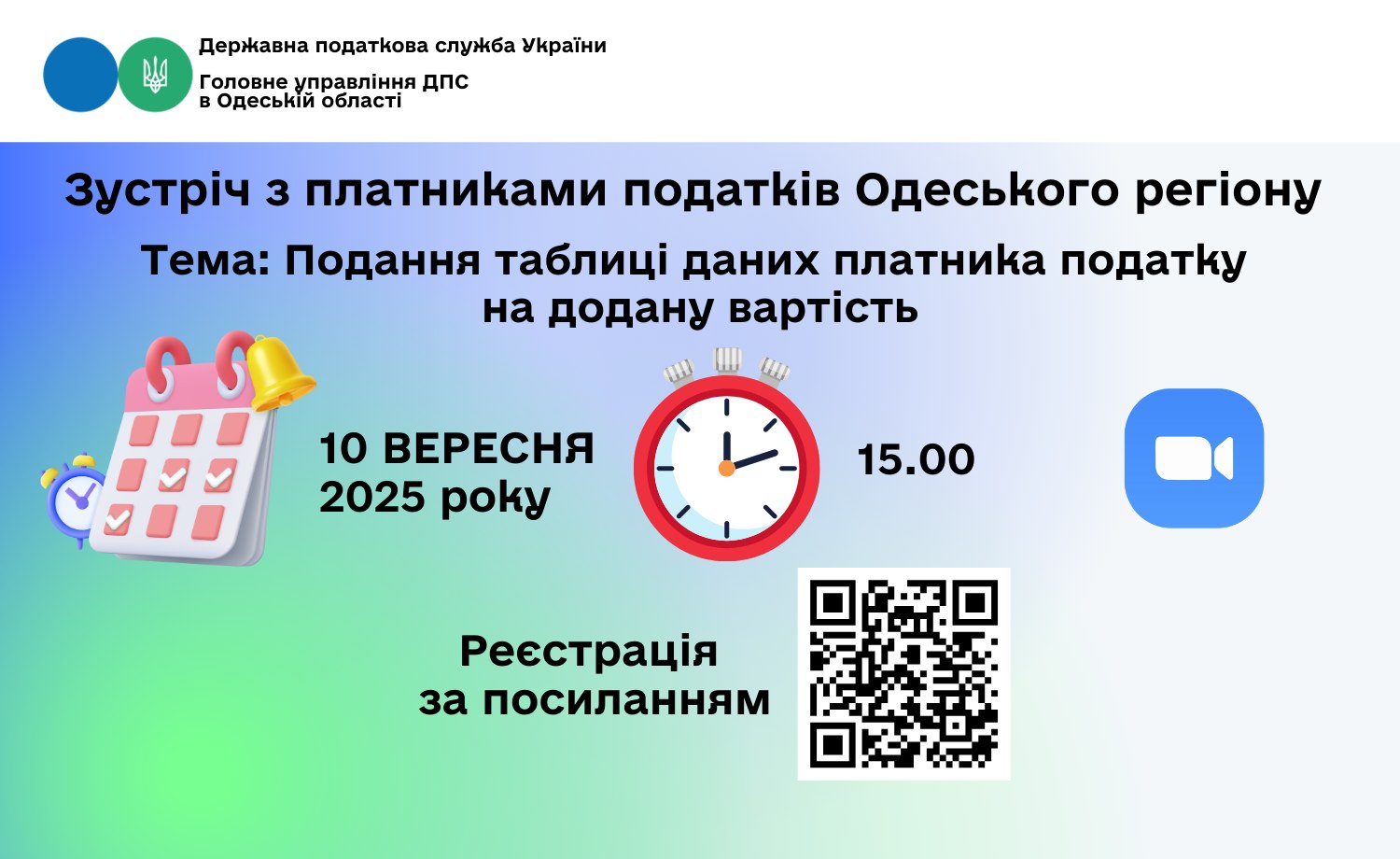 Шановні представники бізнес-спільноти Одеської області! Запрошуємо вас долучитися до важливої онлайн-зустрічі з провідними фахівцями управління з питань виявлення та опрацювання податкових ризиків Головного управління Державної податкової служби в Одеській області. Тема зустрічі: «Подання таблиці даних платника податку на додану вартість». Це унікальна можливість отримати актуальну інформацію та консультації з питань подання таблиці даних платника податку на додану вартість, що є критично важливим для уникнення податкових ризиків та забезпечення належного ведення бізнесу.
