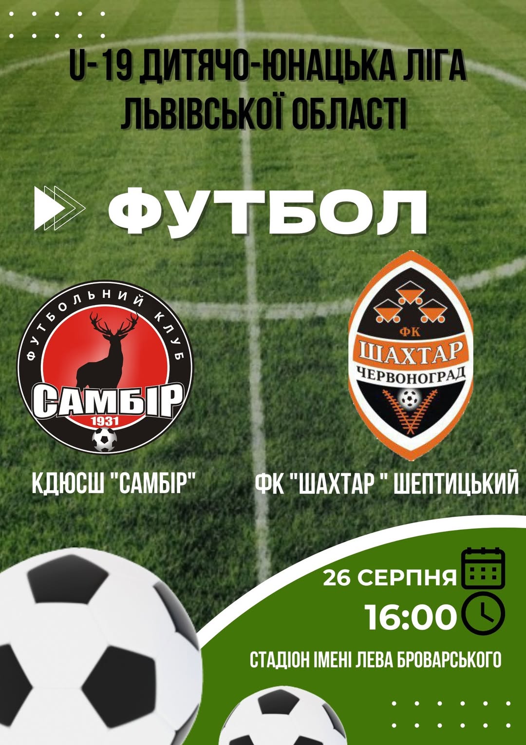 Матч дитячо-юнацької ліги Львівської області з футболу U-19 між командами КДЮСШ Самбір та ФК Шахтар (Шептицький) відбудеться завтра, 26 серпня, о 16:00 на стадіоні імені Лева Броварського у Самборі.