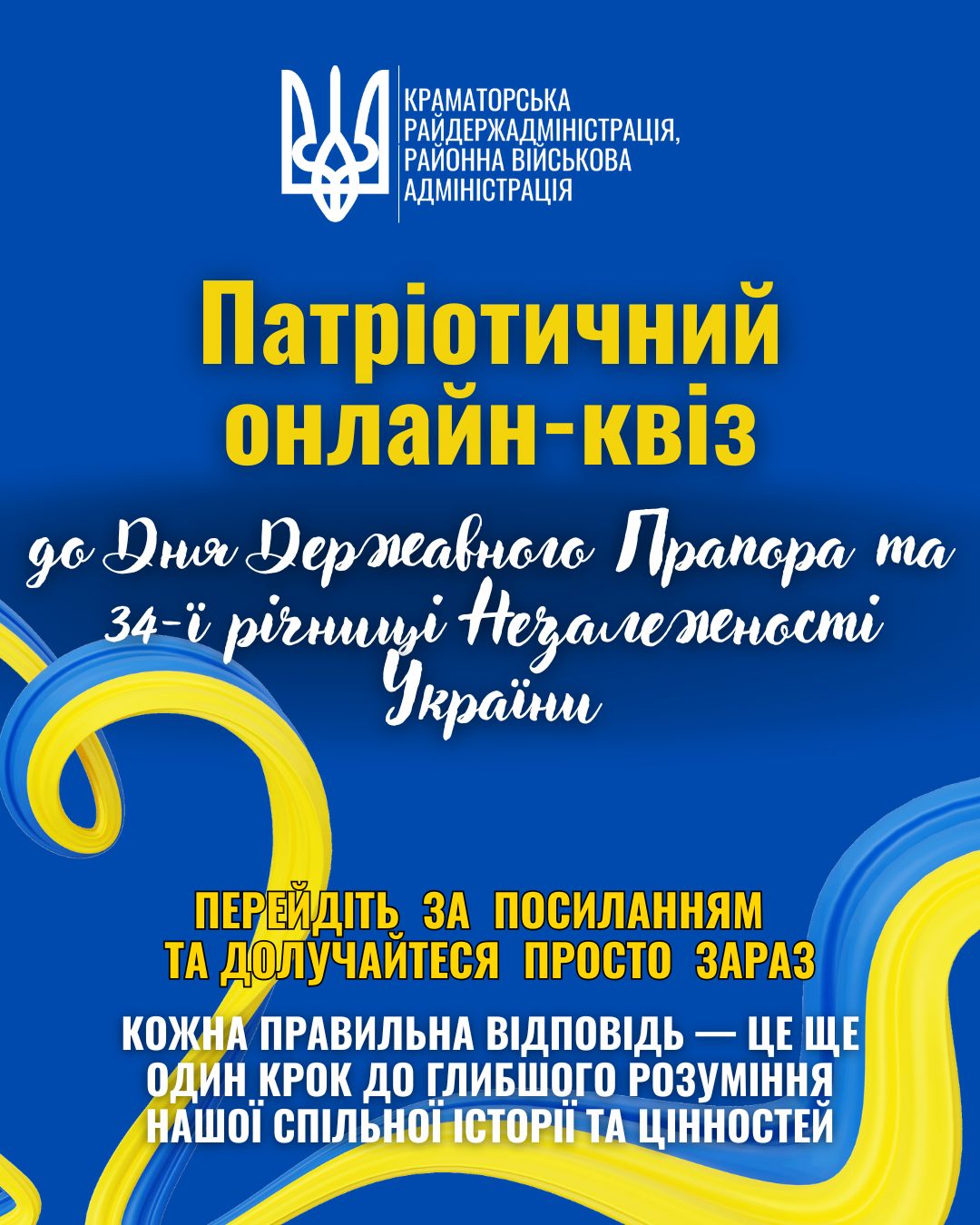 🇺🇦 Запрошуємо всіх долучитися до патріотичного онлайн-квізу «Шлях до Незалежності», присвяченого Дню Державного Прапора та 34-й річниці Незалежності України! Цього року ми відзначаємо 34 роки незламної та суверенної України. Відділ з питань гуманітарної сфери управління забезпечення взаємодії з органами місцевого самоврядування Краматорської райдержадміністрації організовує це онлайн-запитання, щоб разом вшанувати нашу славну історію, багату культуру та невід’ємні символи державності. 💙💛
