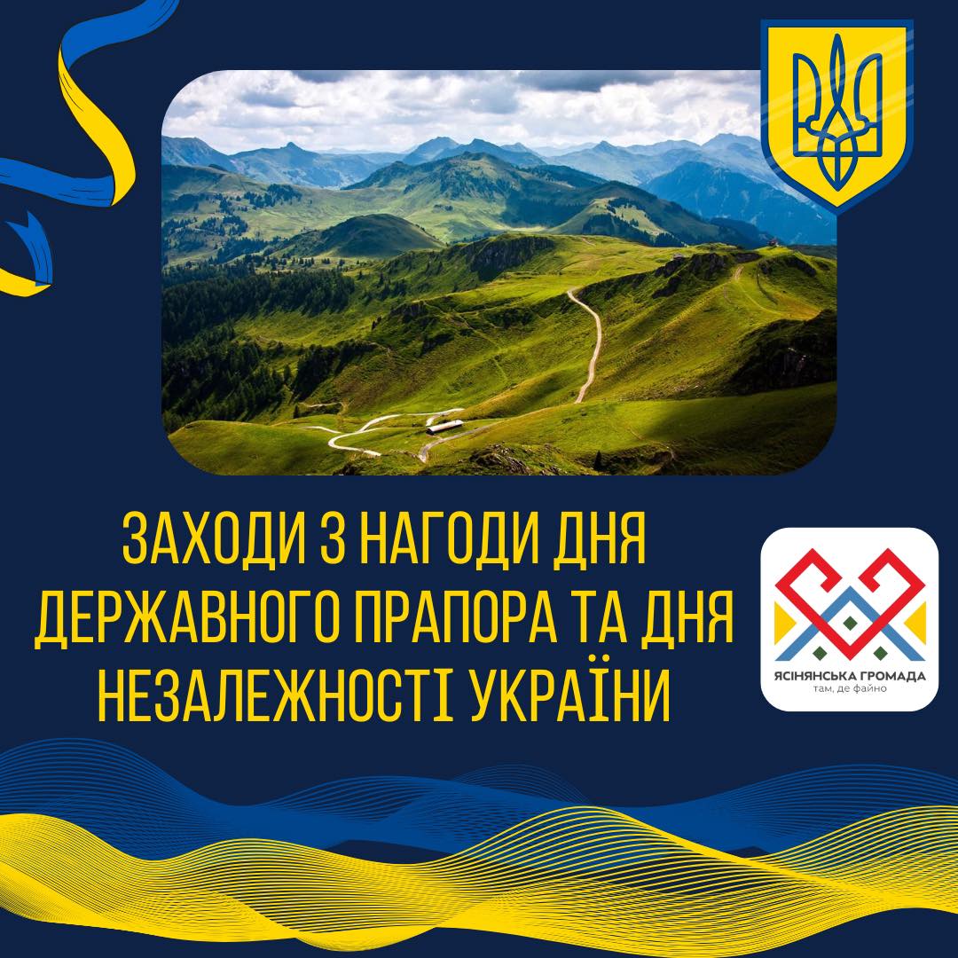 Запрошуємо всіх мешканців та гостей Ясінянської територіальної громади стати частиною урочистих подій, присвячених Дню Державного Прапора України та 34-й річниці Дня Незалежності. Ці дні мають особливе значення, адже ми вшановуємо нашу державність, пам’ять Героїв, які віддали життя за свободу, та об’єднуємося заради майбутнього України.