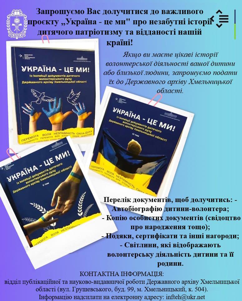 Хмельницька обласна військова адміністрація започаткувала унікальний проєкт під назвою “Україна – це ми!”. Ця ініціатива присвячена збору та збереженню зворушливих історій дитячого патріотизму та відданості нашій Батьківщині. Ми запрошуємо кожного, хто має свідчення про волонтерську діяльність дітей чи їхніх близьких, поділитися цими неоціненними моментами з Державним архівом Хмельницької області.